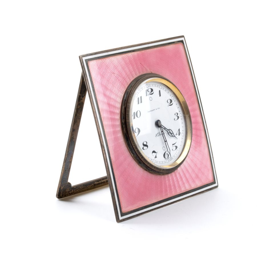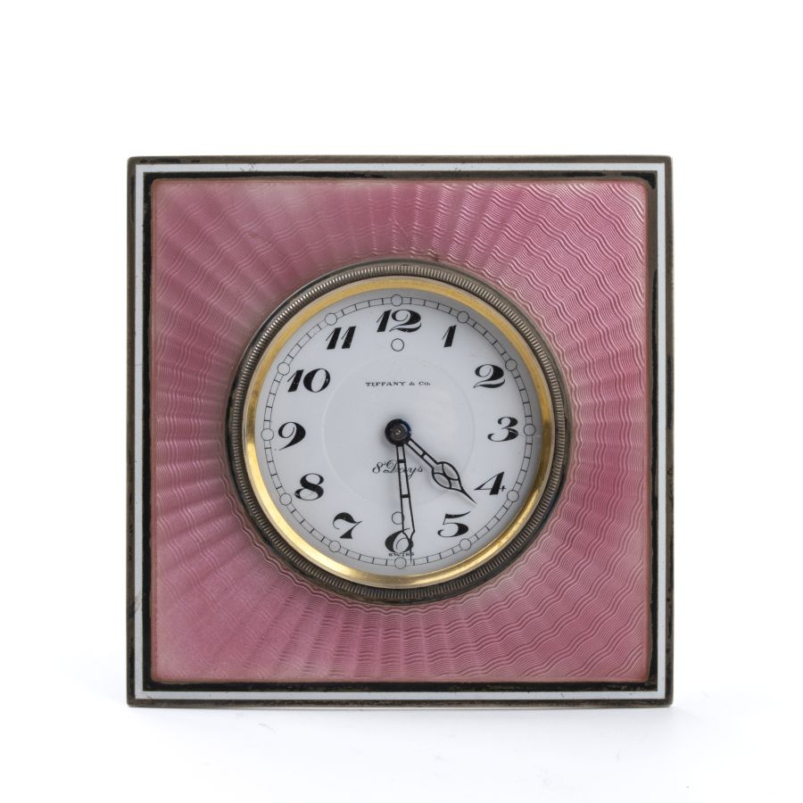 Cassa quadrata in argento 925/1000 con smalti guilloché nei toni del rosa con cornici bianche e nere, quadrante in smalto bianco con numeri arabi e sfere nere riportante le iscrizioni "Tiffany & Co . - 8 Days - Swiss".