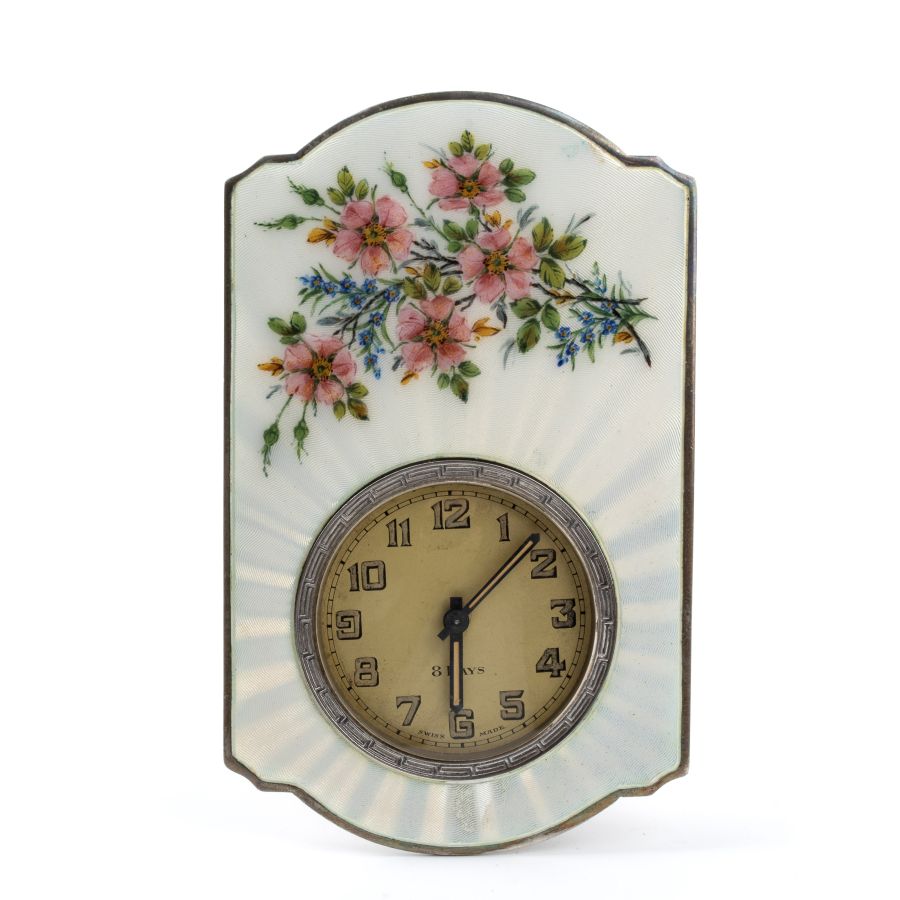 Cassa sagomata in argento 925/1000 con smalti guilloché nei toni de panna con decori floreali policromi, quadrante beige con numeri arabi e sfere luminescenti riportante le iscrizioni "8 Days - Swiss made". Sul piedistallo la firma "Tiffany & Co".