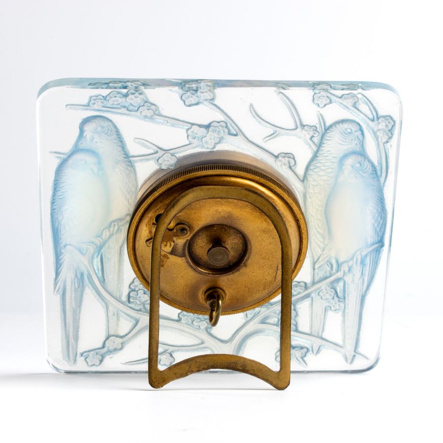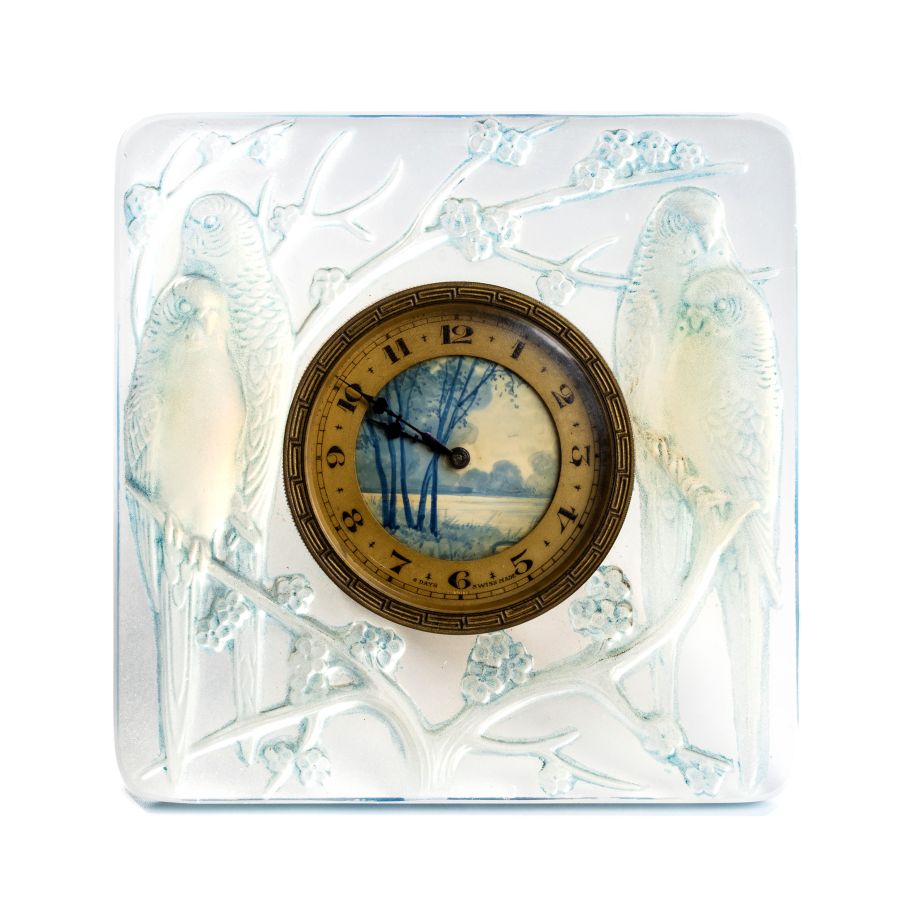René Jules Lalique: Orologio da tavolo in vetro opalescente con inseparabili. Francia, XX secolo
