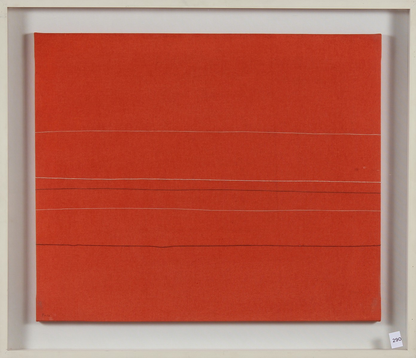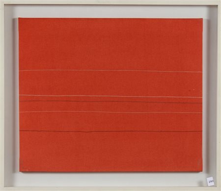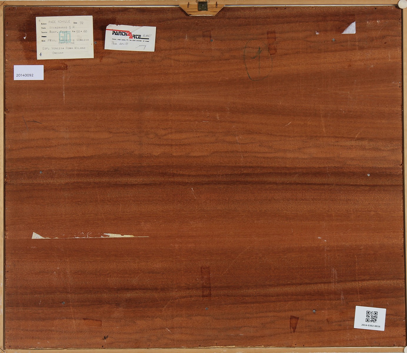 PACE ACHILLE (n. 1923) Itinerario 5 R. 1972. Tecnica mista su tela. Cm 60,00 x 50,00. Firma in basso a sinistra. Al retro etichetta della Galleria Spriano di Omegna e della Galleria Pantha Arte, Como. Pubblicazioni: Arte Moderna Italiana a cura di Vanni Scheiwiller; Galleria Il Traghetto, Venezia, Cartoline. Cornice presente