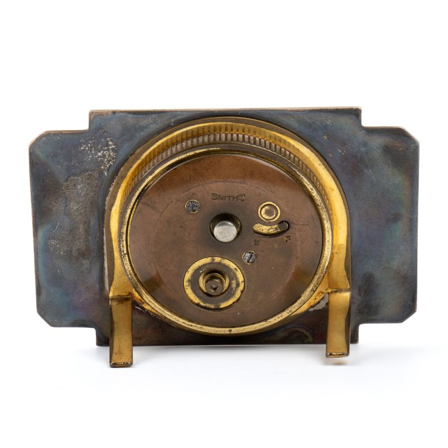 Cassa in argento e smalti nei toni del color indaco, di forma rettangolare, quadrante bianco con numeri arabi, indici a pallino e sfere luminescenti riportante le iscrizioni '8 DAYS - MADE IN ENGLAND'. Nella parte posteriore della cassa 'SMITHS'.