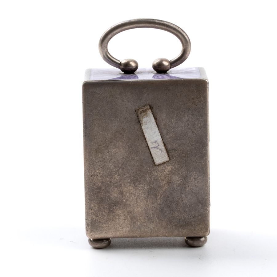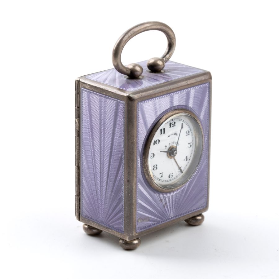 Cassa a "cappuccina" in argento 935/1000 e smalti guilloché nei toni del viola quadrante in smalto bianco con numeri arabi e sfere nere riportante l'iscrizione "8 Jours". Rimessa delle ore e carica a chiave.