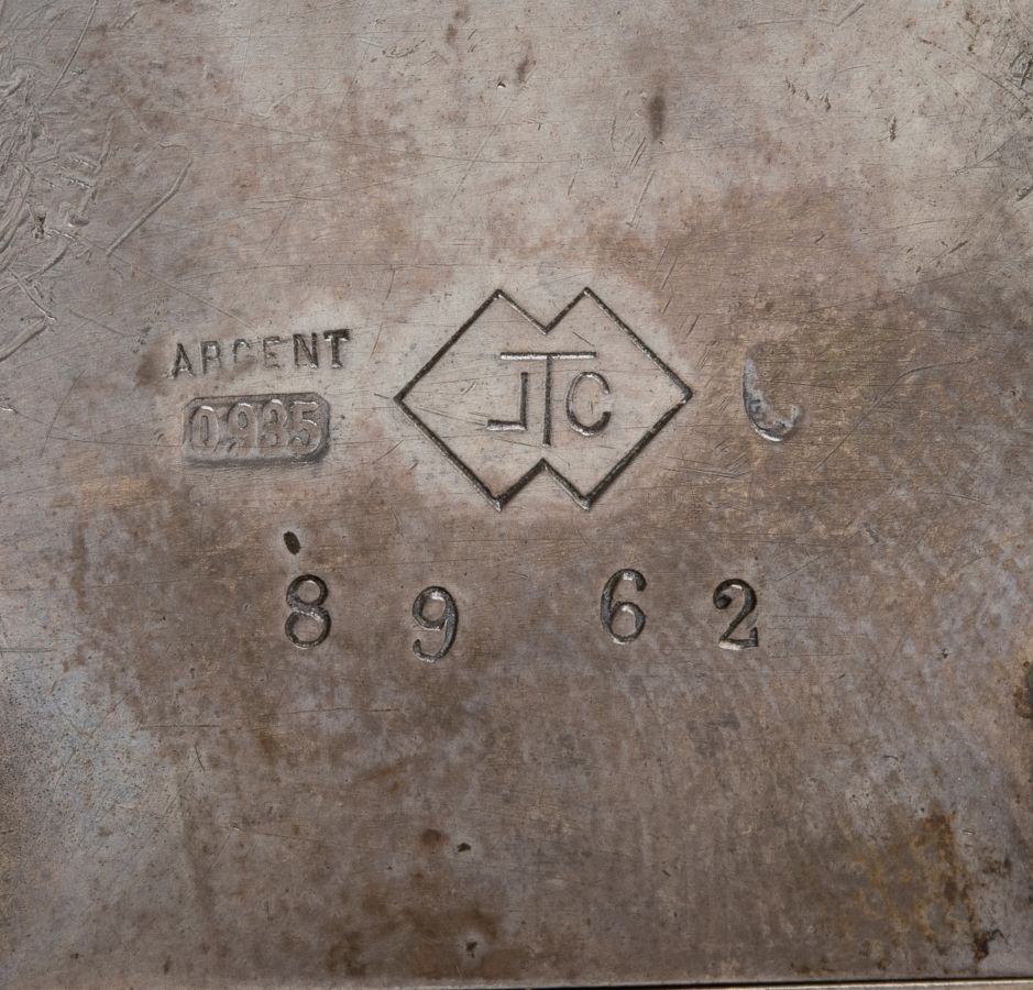 Punzonato nella parte sottostante "Patent - Argent - 0,935 - JTC - 8962" e con i marchi per l'argento 935/1000 in uso in svizzera dal 1882 al 1934. All'interno dello sportellino "211655".