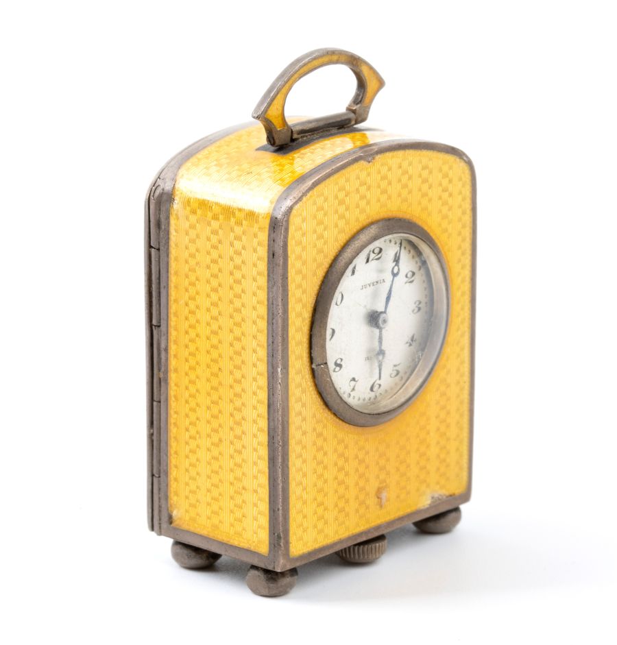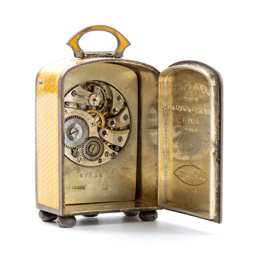Cassa in argento 935/1000 e smalti guilloché nei toni del giallo, quadrante argenté con numeri arabi e sfere nere riportante l'iscrizione "8 Days". All'interno dello sportellino della cassa "ATELIERS JUVENIA - A LA CHAUX DE FONDS (SUISSE) - ET PARIS - STERLING SILVER - JUVENIA MRG SWISS - ARGENT DORE FAB. SUISSE - 0,925 - 47864".