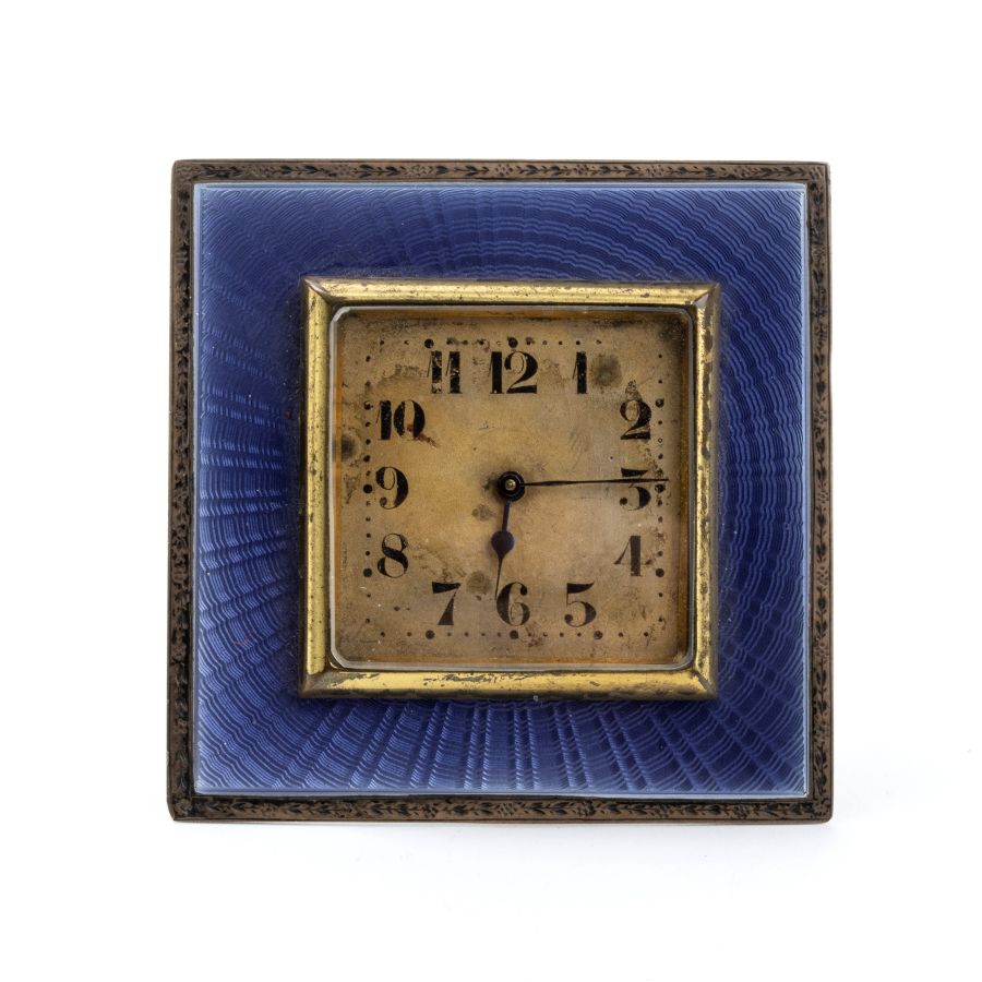 Cassa quadrata in argento 925/1000 con smalti guilloché nei toni del viola, quadrante dorato con numeri arabi e sfere nere. Rimessa delle ore e carica a chiave.
