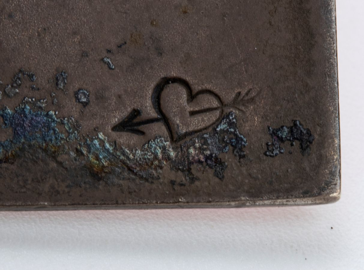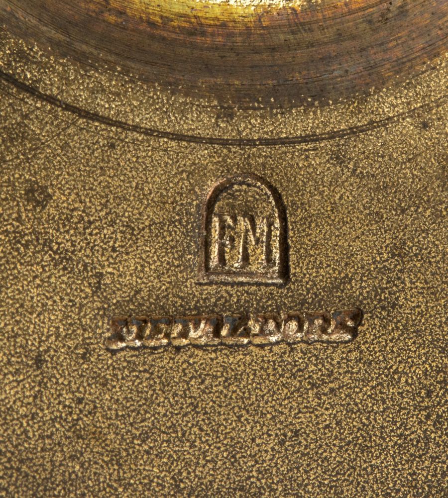 Cassa quadrata in ormulu decorata a motivi geometrici con smalti guilloché nei toni del rosa e smalti neri. Quadrante dorato con numeri arabi e sfere luminescenti riportante le iscrizioni "Henry Capt Geneve". Sulla cassa "FM - Metal Dore" e simbolo di un core trafitto da una freccia. Dietro la cornice "31701".