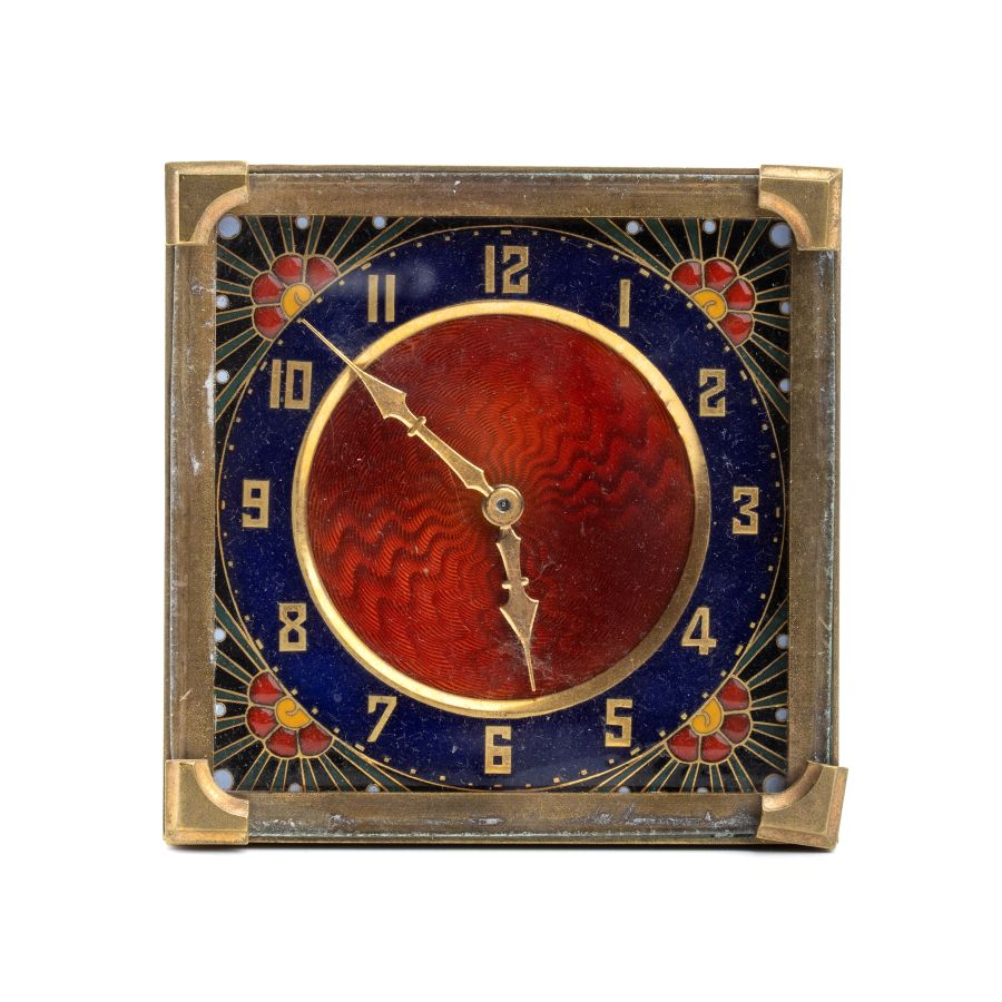 Cassa quadrata in ottone, quadrante con smalti policromi laterali e smalti guilloché nei toni del rosso centrale, lunetta blu con numeri arabi e sfere dorate.