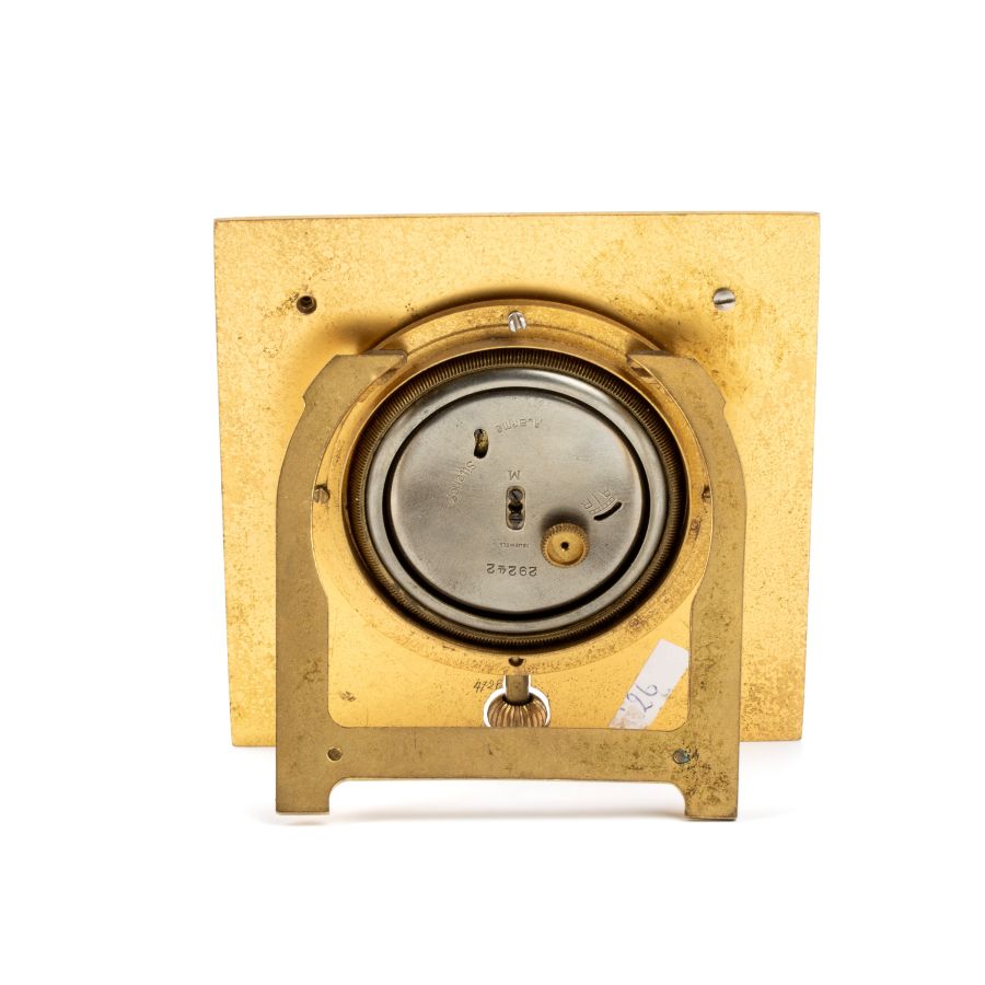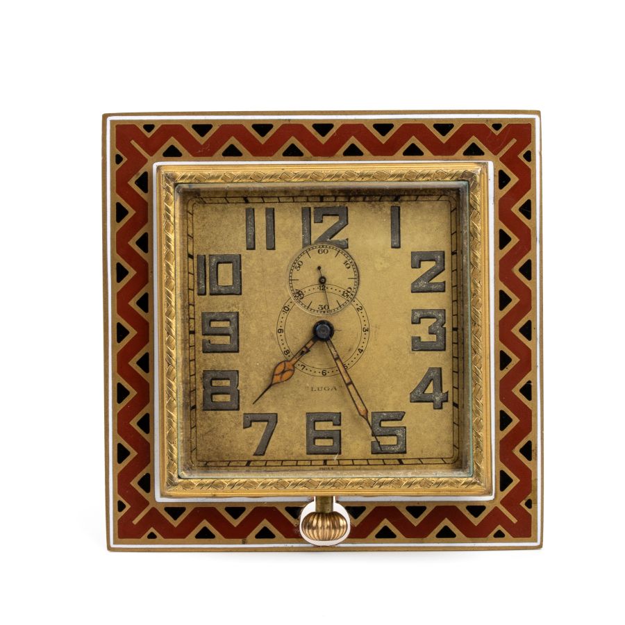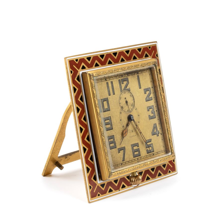 Luga: Orologio sveglia da tavolo Art Déco in metallo dorato e smalti policromi. Svizzera, anni '20 - '30