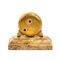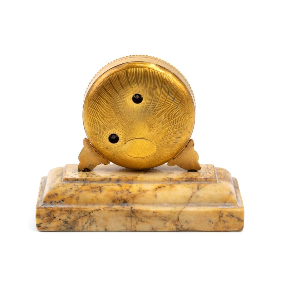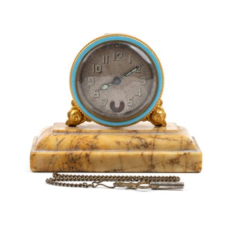 Cassa in metallo dorato poggiante su un basamento gradinato in marmo giallo, lunetta in smalti nei toni dell'azzurro, quadrante argenté con numeri arabi e sfere luminescenti, riportante l'iscrizione "Swiss made"; pendolo a vista. Rimessa delle ore e carica a chiave.