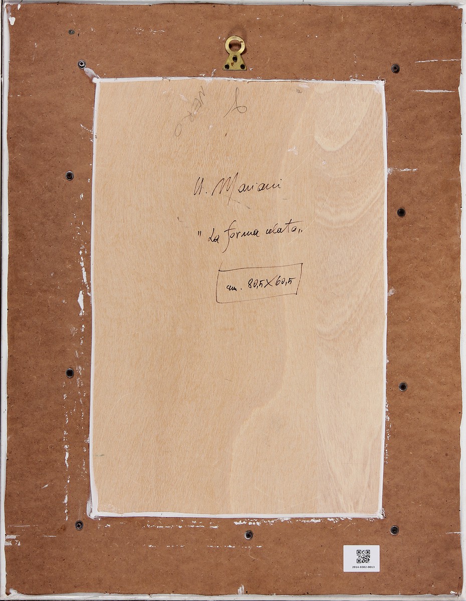 MARIANI UMBERTO (n. 1936) La forma celata. Vinilico e sabbia su piombo su tavola. Cm 60,50 x 80,50. Titolo e firma al retro. Cornice presente