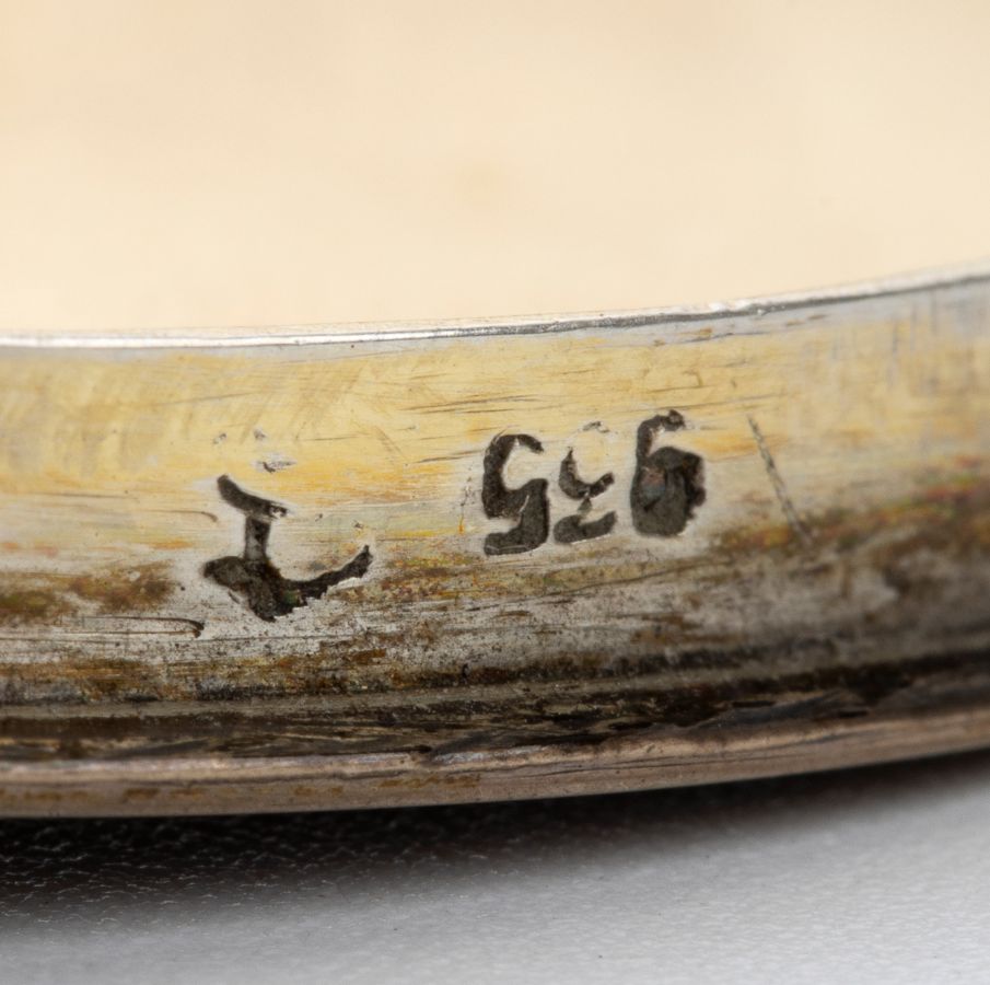 Cassa di forma rettangolare con parte superiore stondata, in argento 935/1000 con smalti guilloché nei toni del viola; quadrante dorato con numeri arabi e sfere nere. Rimessa delle ore e carica a chiave.