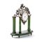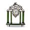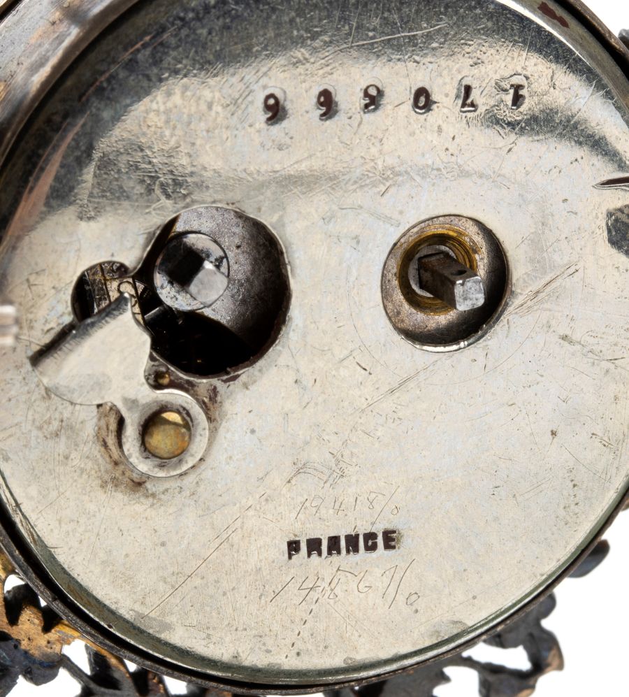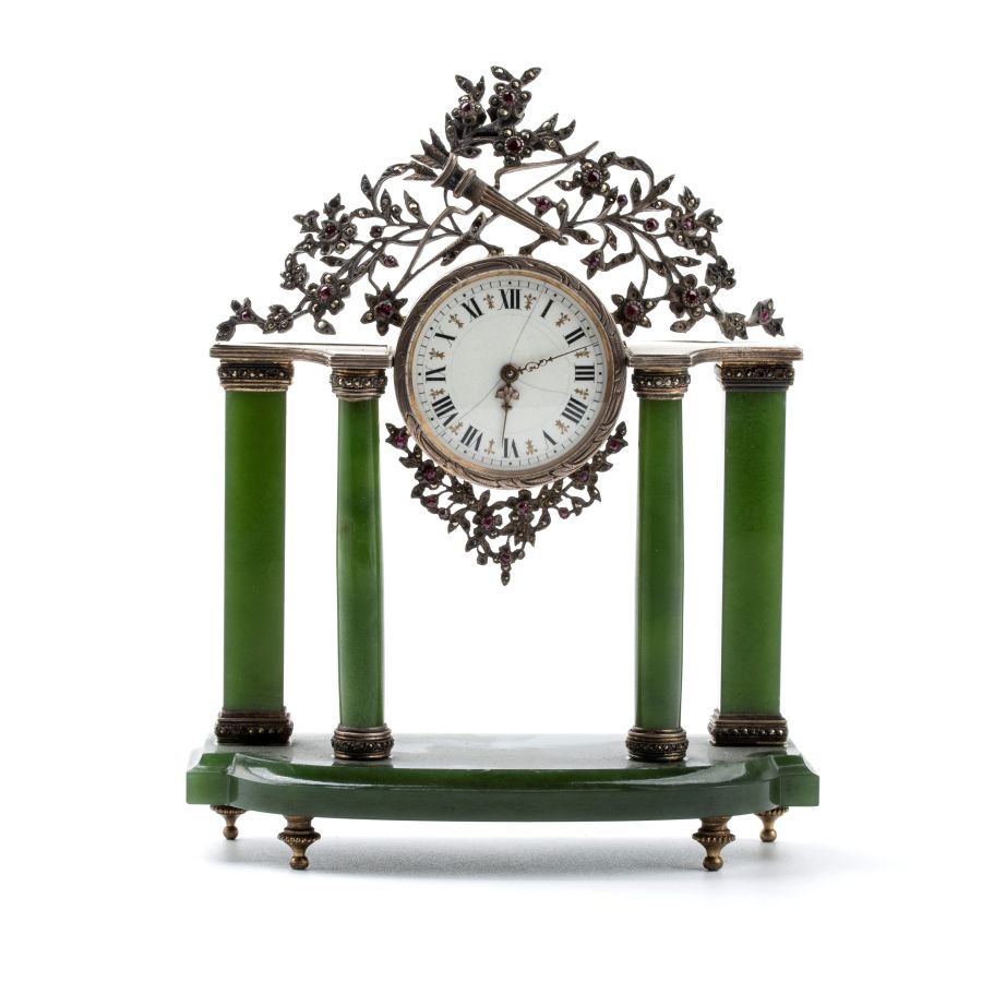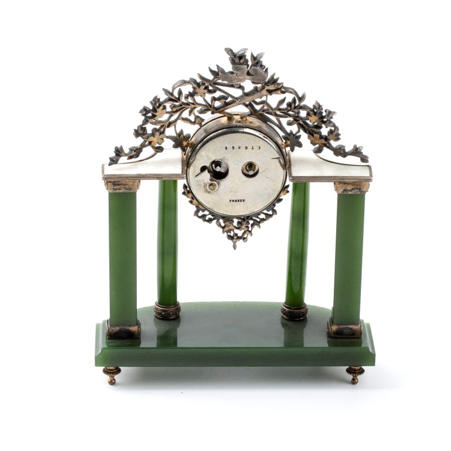 Cassa a tempietto con basamento e colonne in giada, cimatura in argento a morivi floreali con arco e frecce incastonata con marcassiti e pietre colorate; cassa dell'orologio in argento, quadrante in smalto bianco con numeri romani e sfere dorate. Nella parte posteriore della cassa "2170566 - FRANCE". Rimessa delle ore e carica a chiave.
