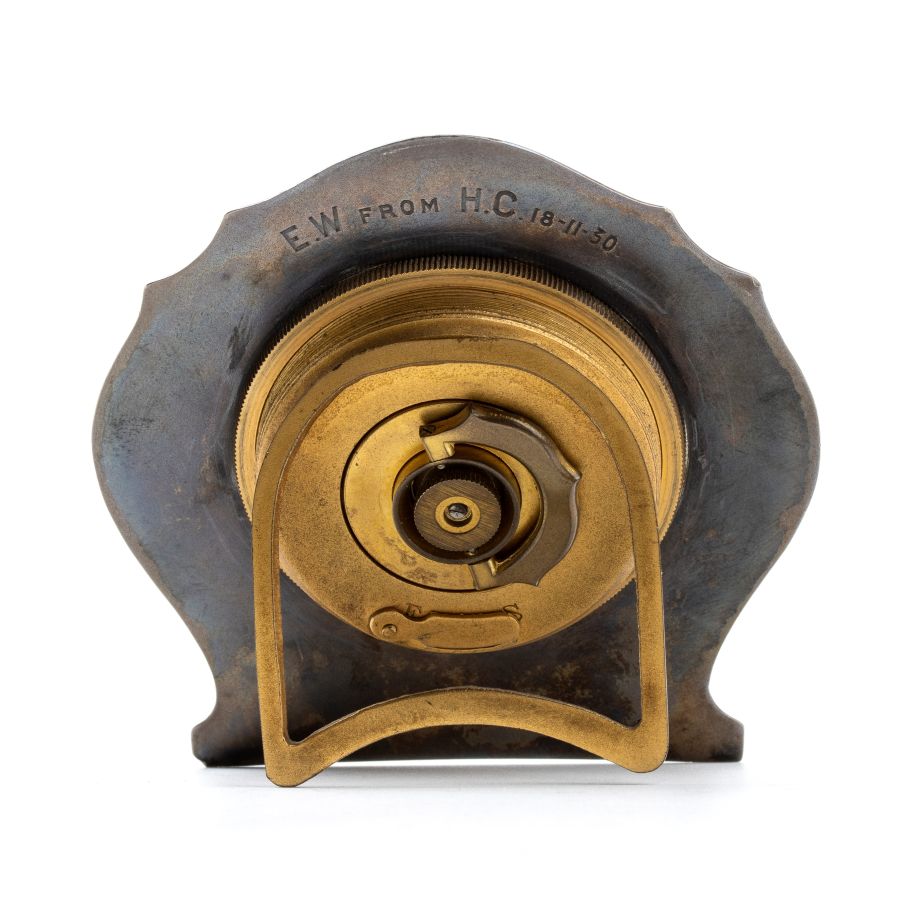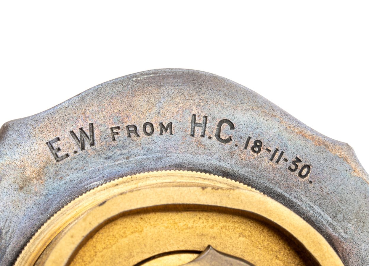 Cassa in argento di forma rotonda sagomata e smalti guilloché nei toni del blu, quadrante argenté con numeri arabi riportante le iscrizioni "8 Days - Swiss made". Nella parte posteriore l'iscrizione "E.W FROM H.C. 18-11-30".