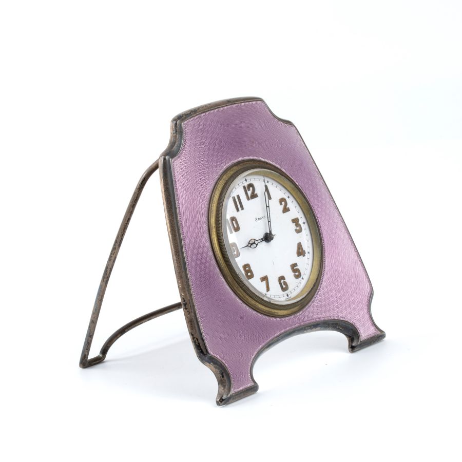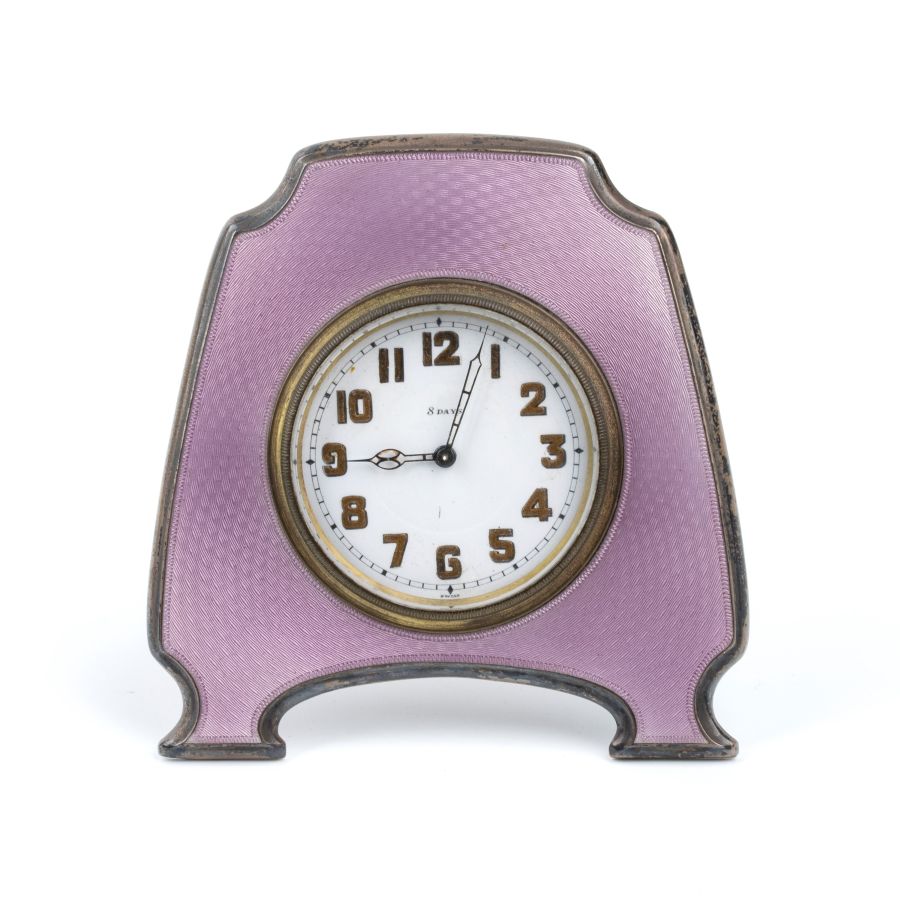 Cassa in argento 925/1000 e smalti guilloché nei toni del rosa, di forma rettangolare sagomata, quadrante bianco con numeri arabi dorati riportante le iscrizioni "8 days - Swiss".