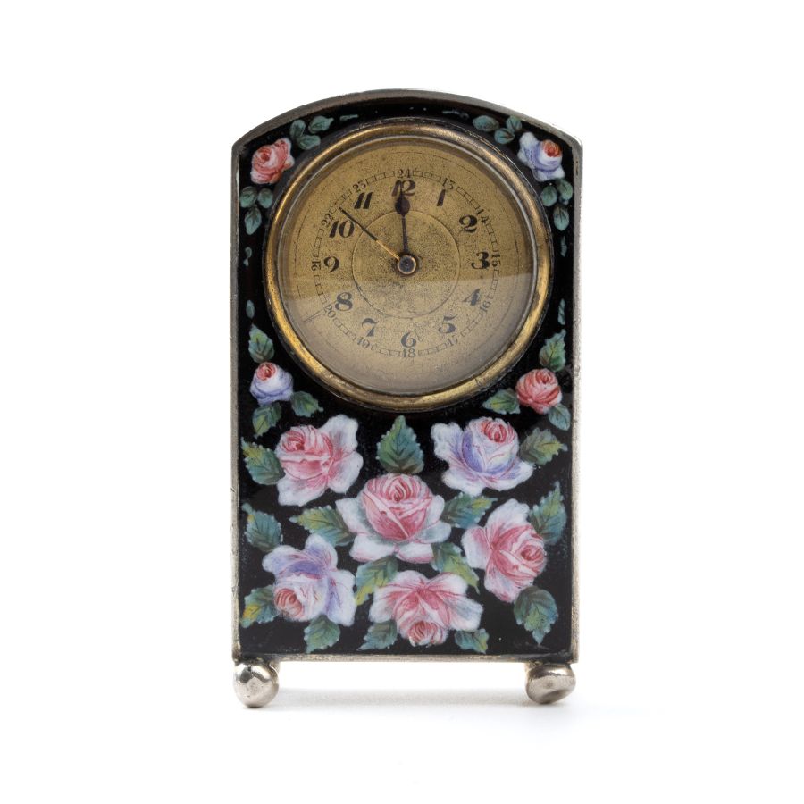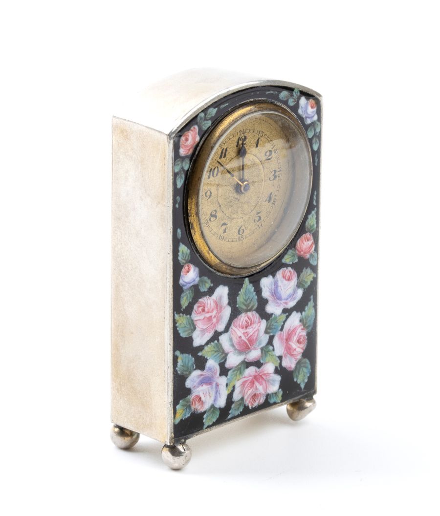 Cassa rettangolare in argento decorata con fiori e foglie in smalti policromi, quadrante dorato con numeri arabi e sfere nere. Rimessa delle ore a chiave.