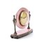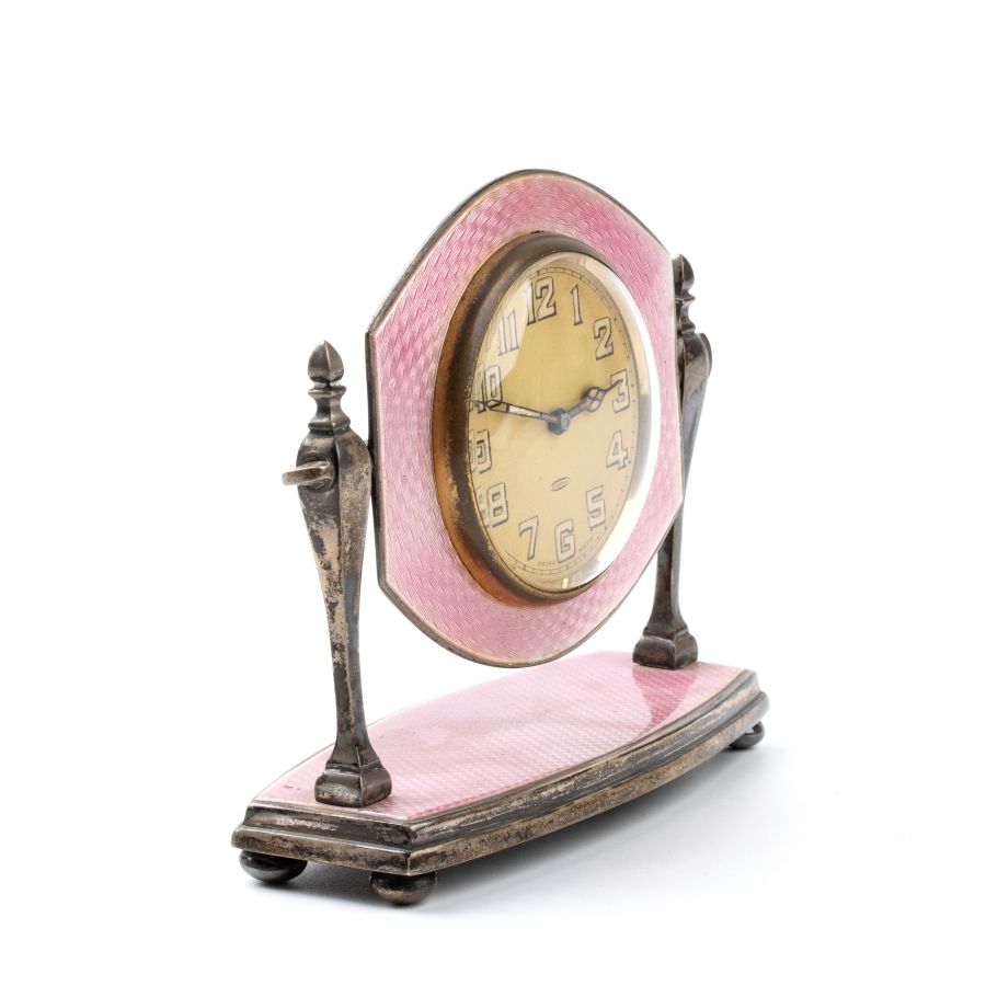 Cassa in argento 925/1000 con smalti guilloché nei toni del rosa poggiante su basamento basculante, quadrante dorato con numeri arabi e sfere luminescenti riportante le iscrizioni "8 Days - Swiss made". Rimessa delle ore a chiave.