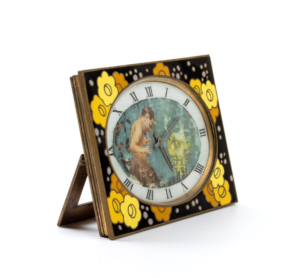 Orologio sveglia da tavolo Art Déco con smalti. Francia, anni '30