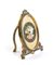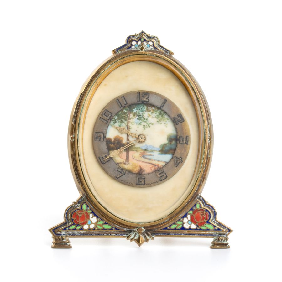 cassa ovale poggiante su un basamento decorato con smalti policromi, cornice nei toni del beige, quadrante dipinto con un paessagio fluviale con numeri arabi e sfere luminescenti, riportante l'iscrizione "8 Days - Swiss Made".