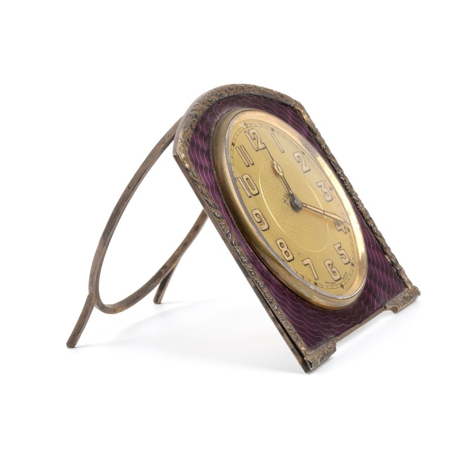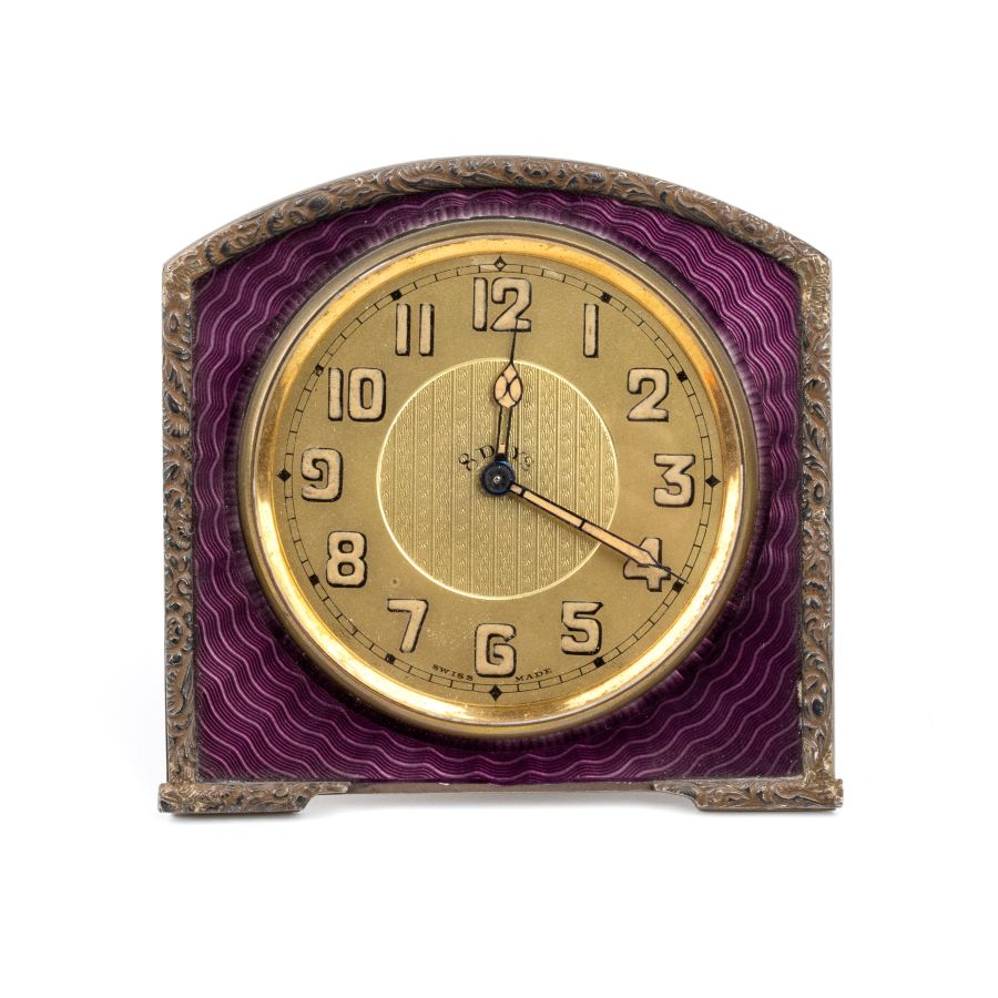 Cassa in metallo dorato con smalti guilloché nei toni del viola e cornice perimetrale, quadrante dorato con numeri arabi e sfere luminescenti riportante le iscrizioni "8 days - Swiss made". Nella parte posteriore della cassa "Swiss made - 83", marchio non leggibile.