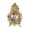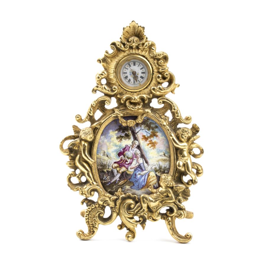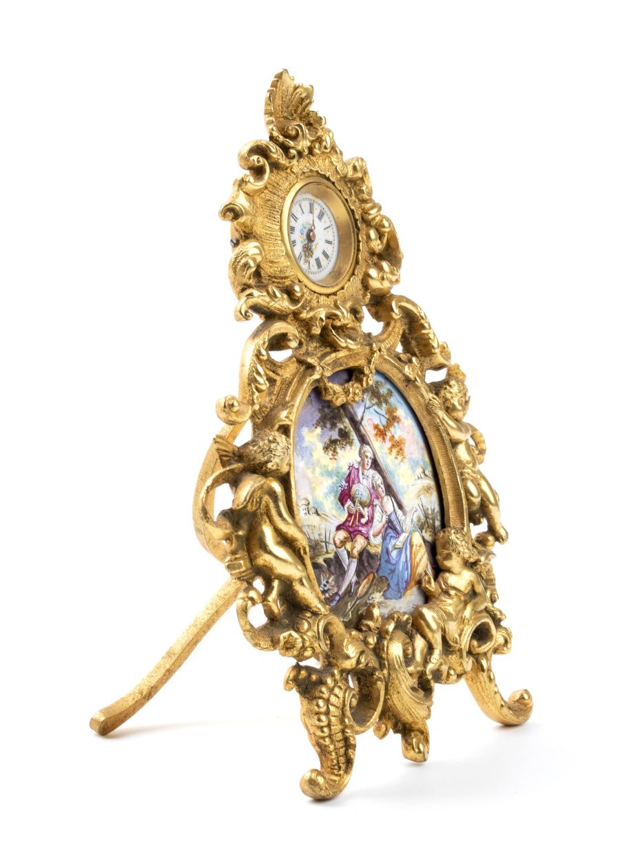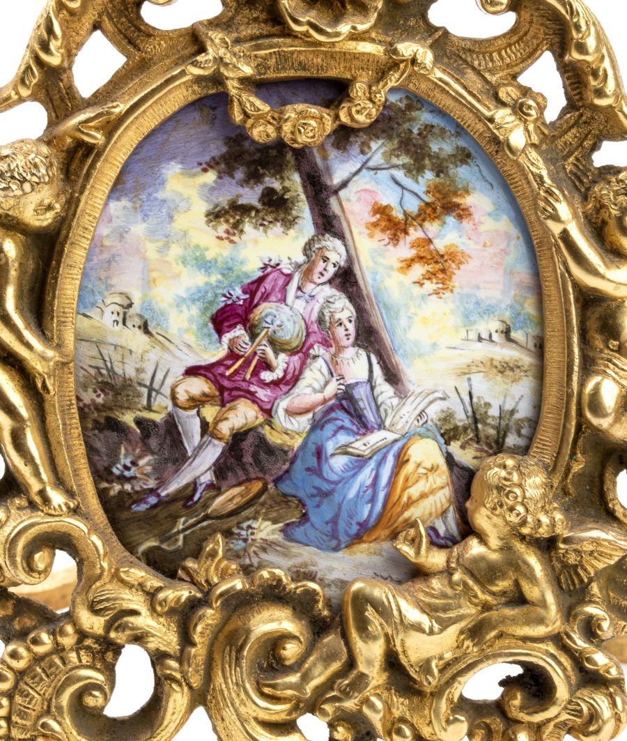 Cassa sagomata in metallo dorato raffigurante cherubini che sostengono un medaglione centrale dipinto in policromia con una scena galante. Quadrante in smalto bianco con numeri romani e sfere dorate. Carica a chiave.