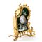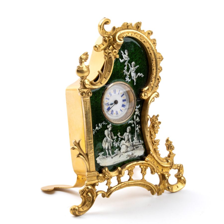 Cassa sagomata in metallo dorato e smalti guilloché nei toni del verde decorato con una scena galante. Quadrante in smalto bianco con numeri romani e sfere nere.