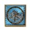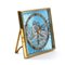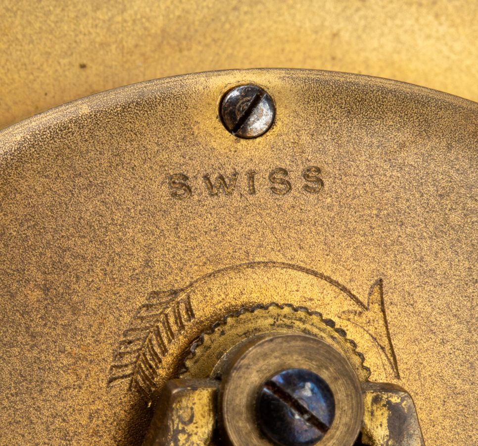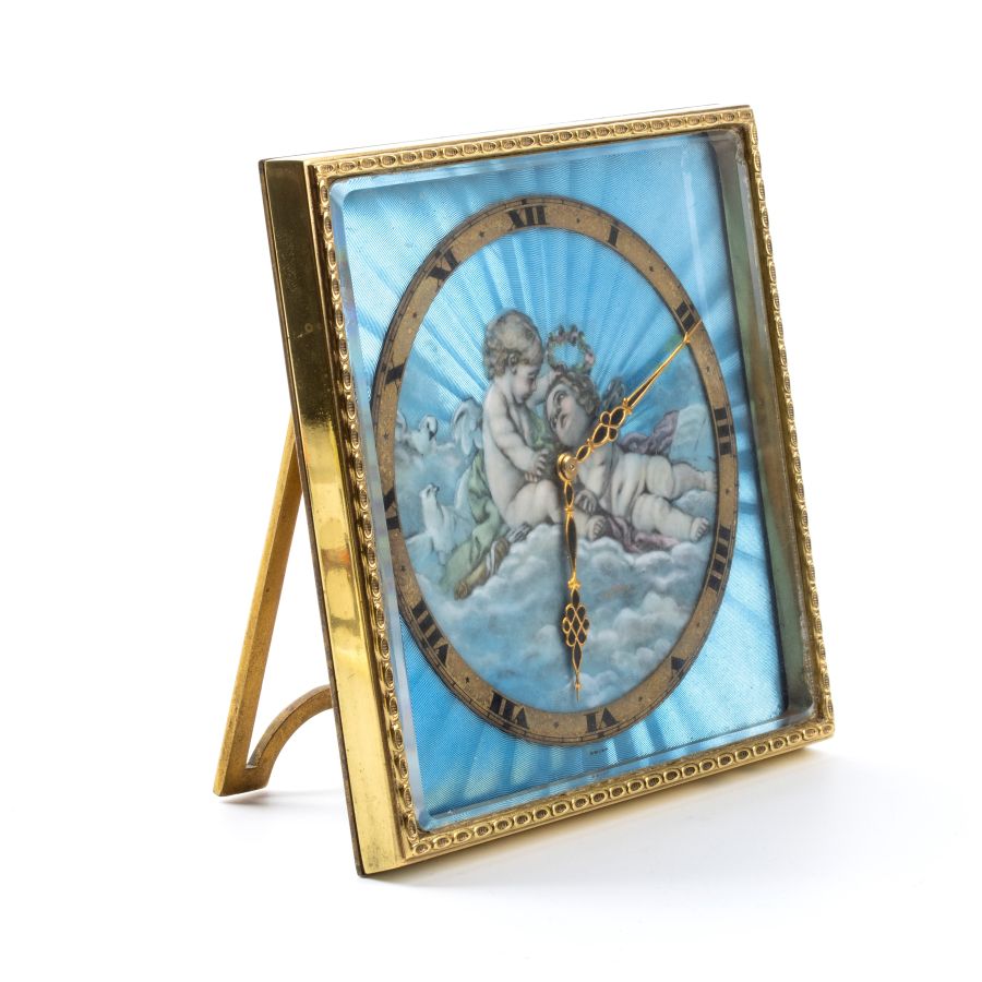 Cassa di forma quadrata in metallo dorato, quadrante in smalto guilloché nei toni del blu decorato nella parte centrale con due putti, lunetta dorata con numeri romani neri e sfere dorate riportante l'iscrizione "Swiss". Nella parte posteriore "8 Days - 21673 - 1650".