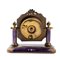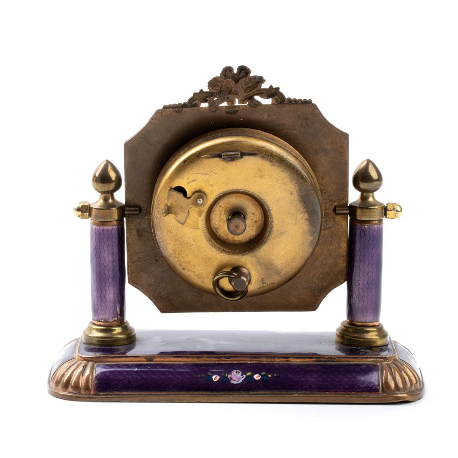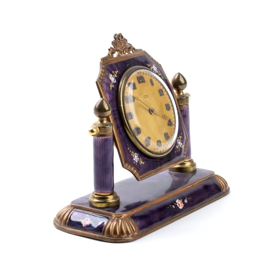 Cassa metallo dorato con smalti guilloché nei toni del viola con decori floreali policromi poggiante su basamento basculante, quadrante dorato con numeri arabi e sfere dorate riportante le iscrizioni "8 Days - Swiss made".