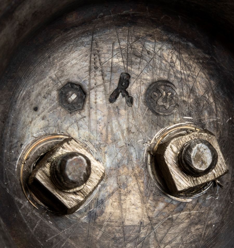 Argento 800/1000, punzonate con i marchi in uso a Milano, Lombardo-Veneto tra il 1812 ed il 1872e con il marchio dell'argentiere Emanuele Caber, attivo in Contrada di San Michele al Gallo fino al 1850, anno della sua morte.