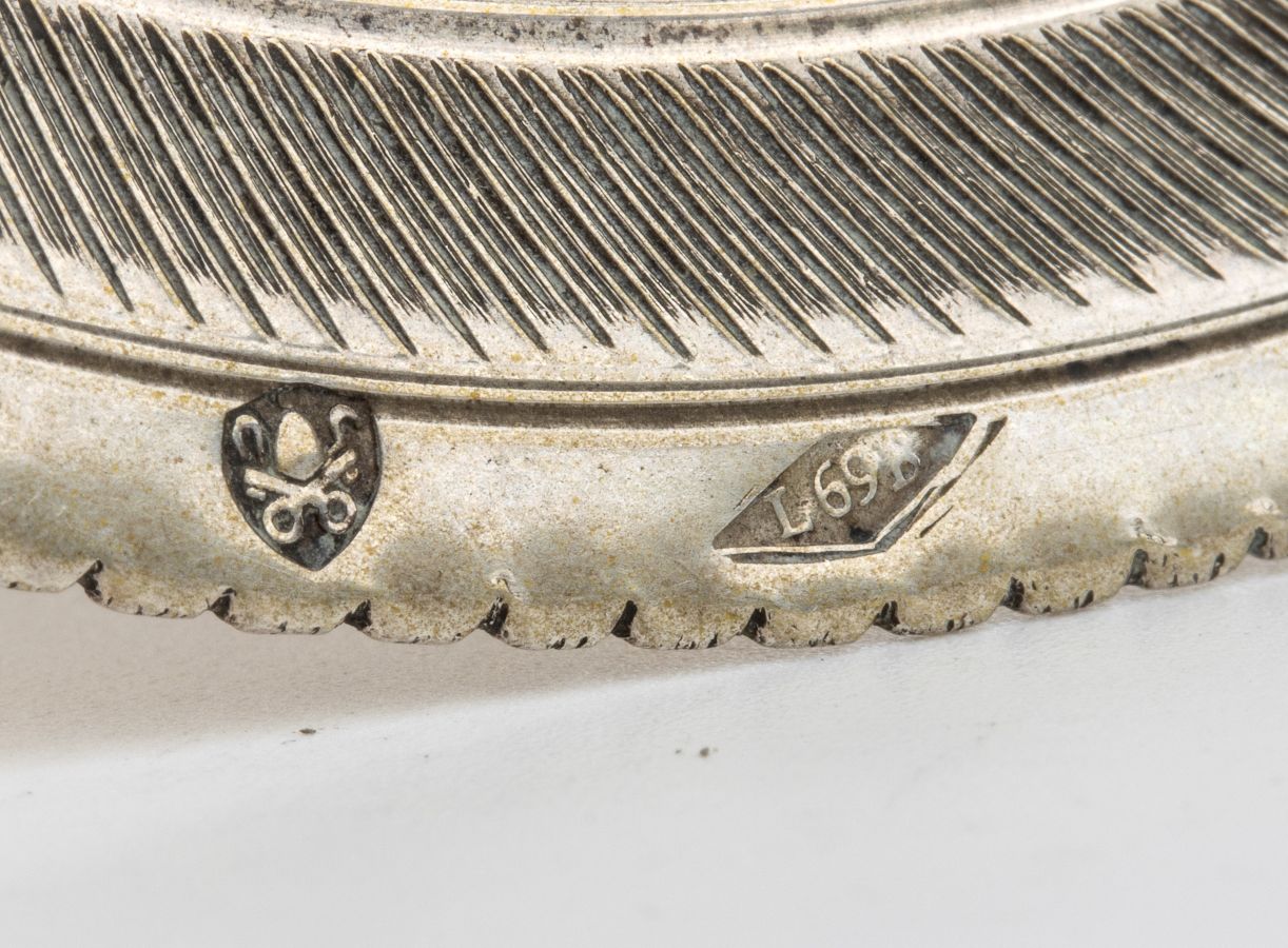 Argento 889/1000, punzonate con i marchi camerali in uso a Roma dopo il 1815 per l'argento al titolo a 10 once e 16 denari (889/1000) e con il marchio "L69B" dell'argentiere Luigi Budoni, patentato maestro nel 1835 e attivo fino al 1852, anno in cui restituisce il suo punzone.