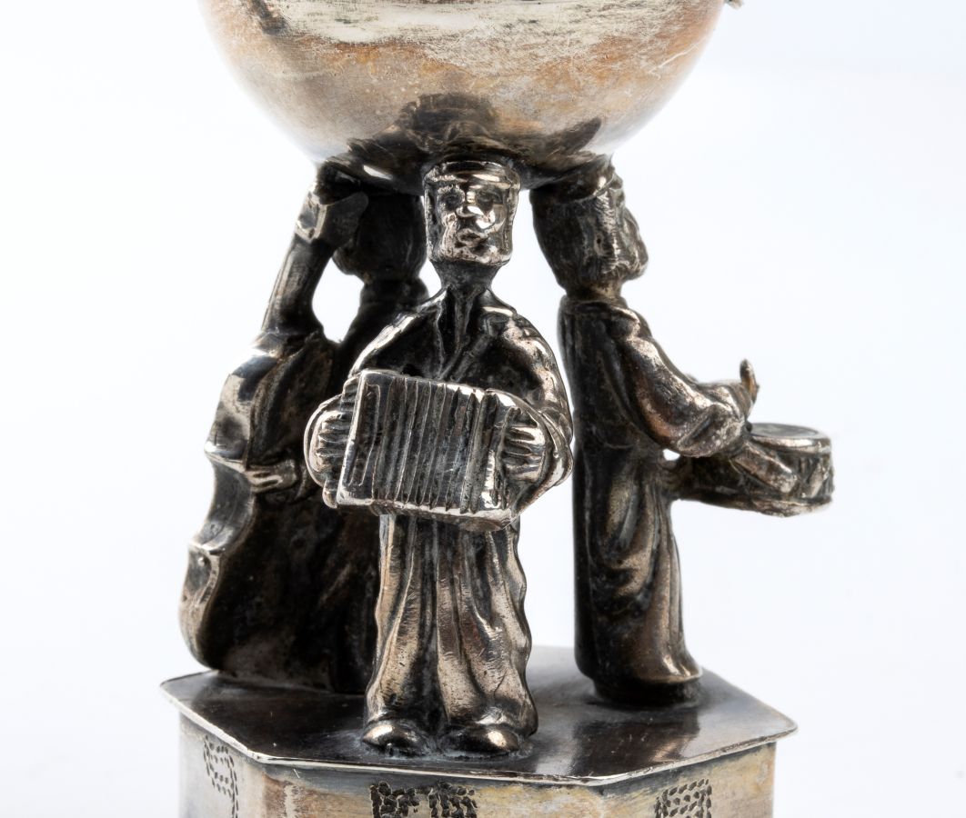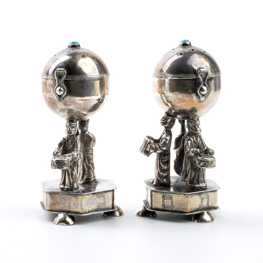 raffiguranti tre e due figure di musicanti su base esagonale, sulle quali sono collocati i contenitori sferici con coperchi incernierati cimati da un cabochon di turchese.