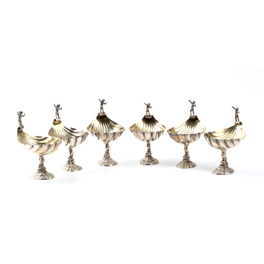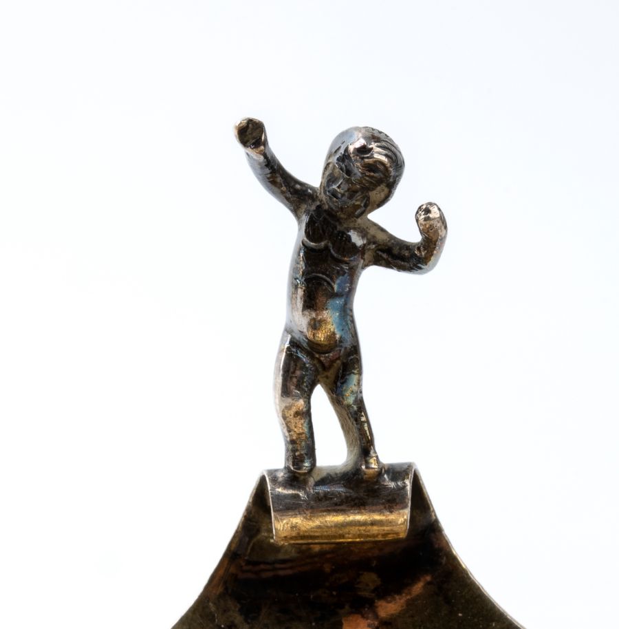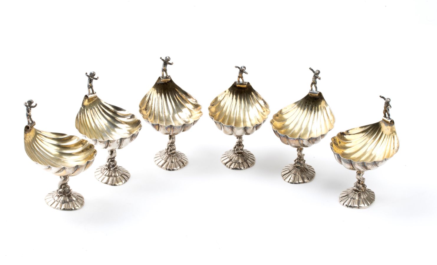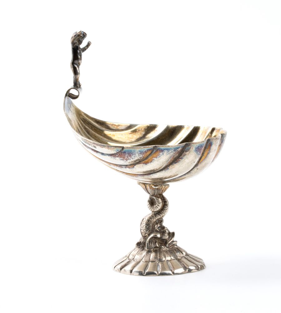 base ovale con fusto a forma di tritone che sorregge le vasche a conchiglia con putti danzanti e interni vermeille.