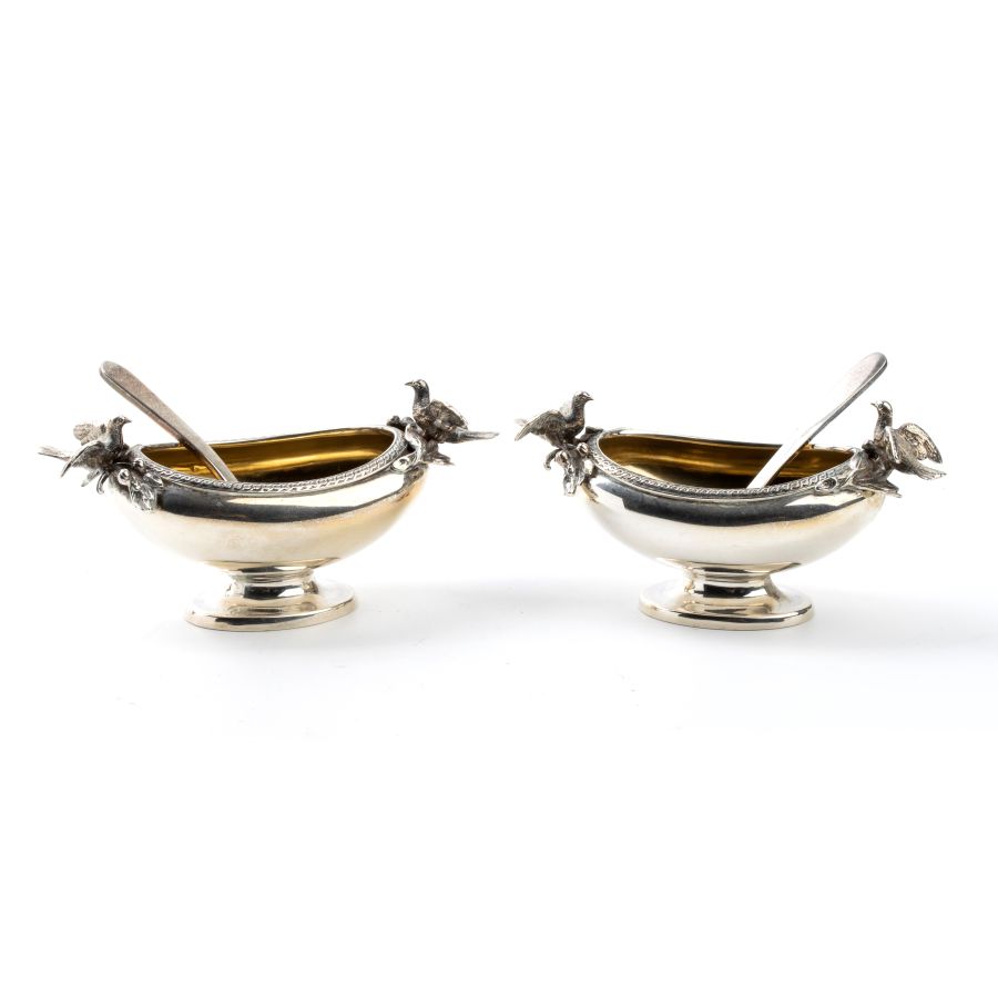 di forma ovale, con decorazioni vegetali e prese laterali a forma di volatile; interni dorati. Le saliere sono dotate di due cucchiaini.