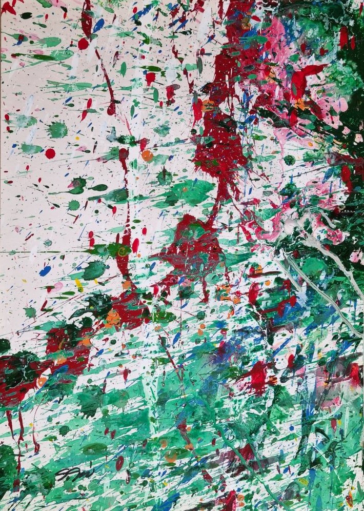 SHIMAMOTO SHOZO Osaka 1928 - 2013 "Senza titolo" Acrilico e schegge di vetro su carta cm 38,2x54,2 del 2010. Certificato di autenticità a cura dell'archivio Shozo Shimamoto.