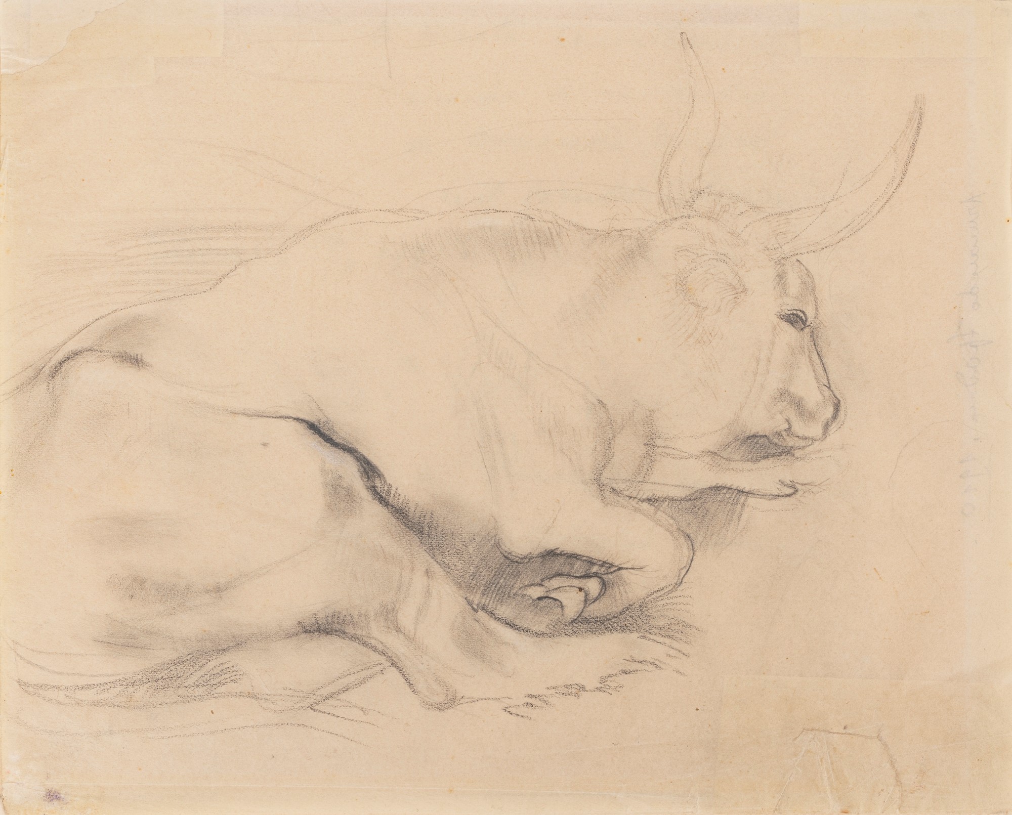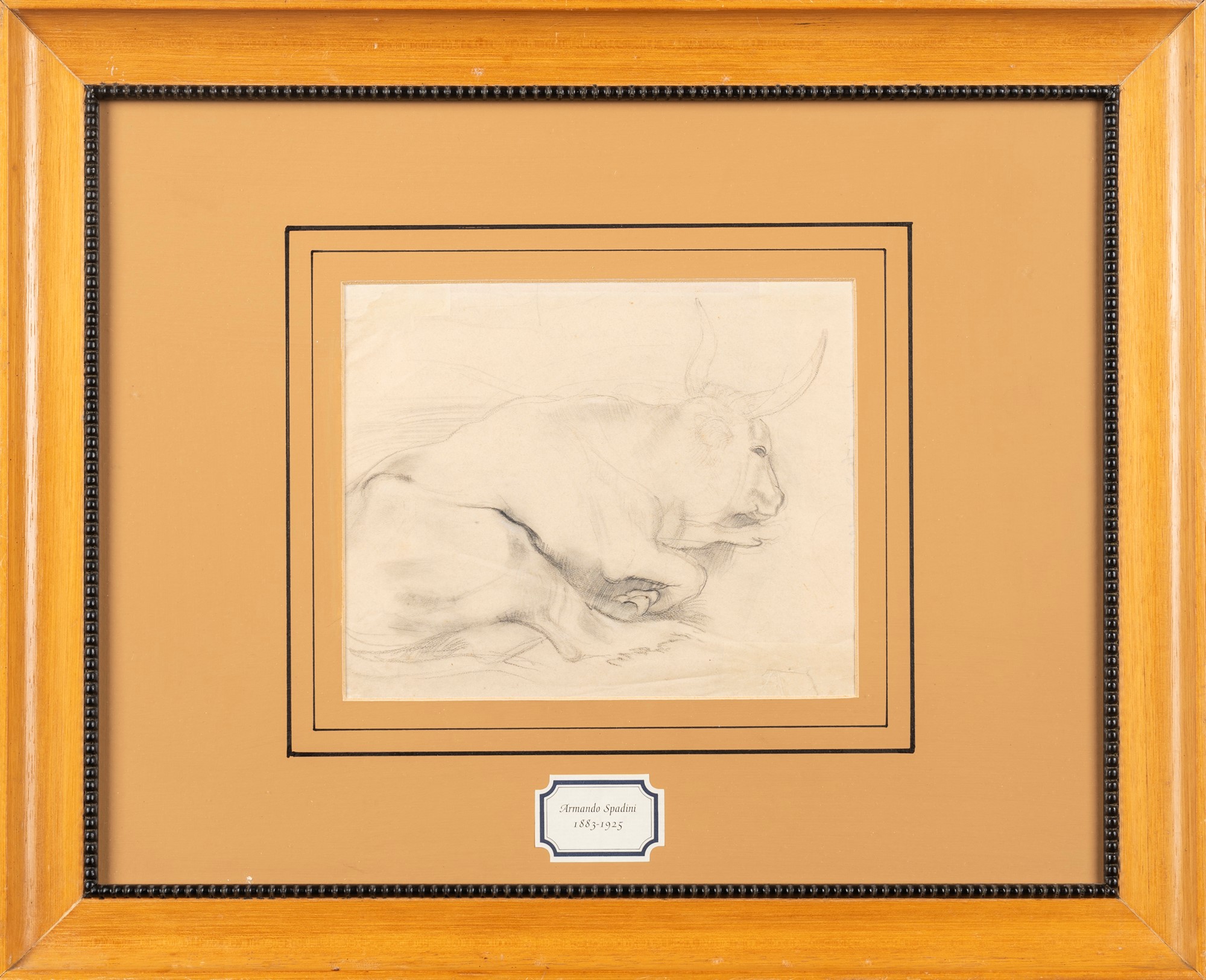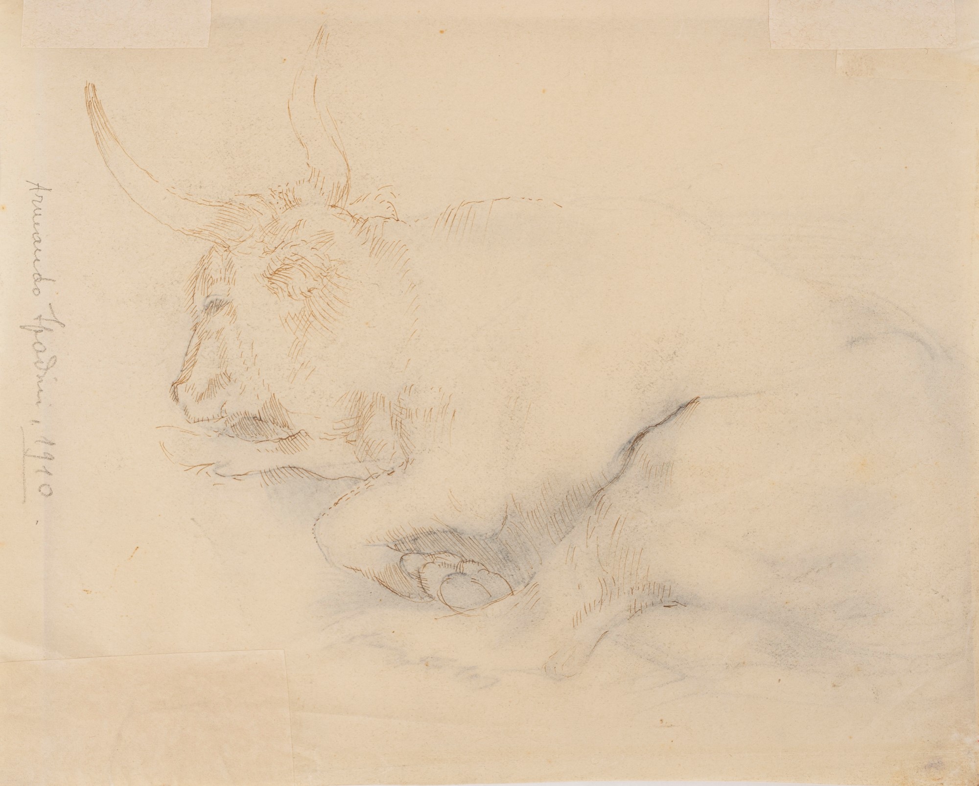al verso, bozzetto a china con bue disteso e iscrizione con data: Armando Spadini 1910.