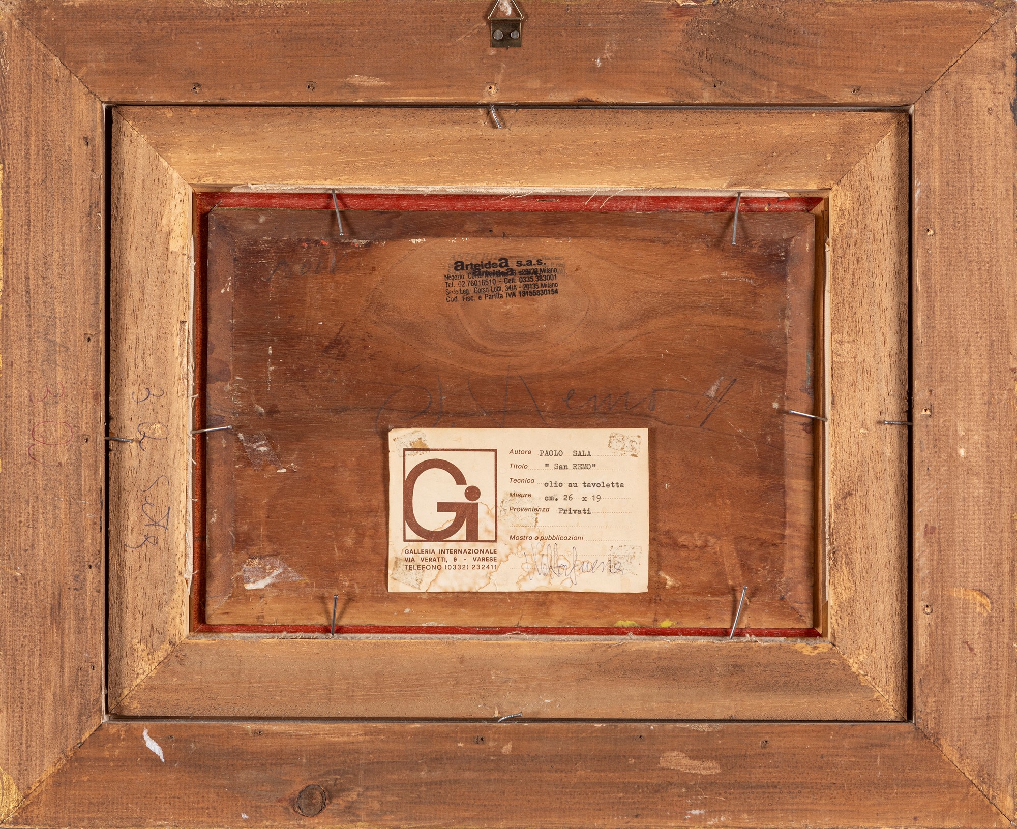 al retro, sulla tavola, cartellino a stampa della Galleria Internazionale di Varese; timbro di Arteidea di Milano