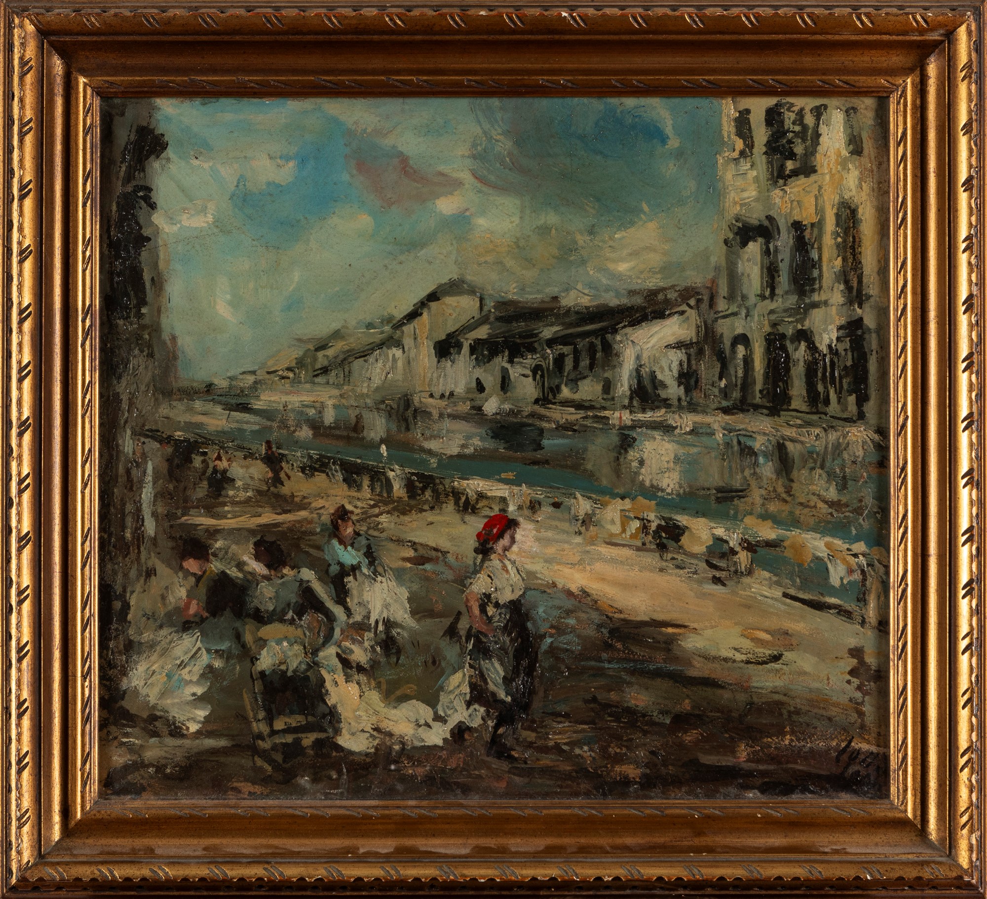 Scuola lombarda, secolo XIX - Lavandaie sul Naviglio