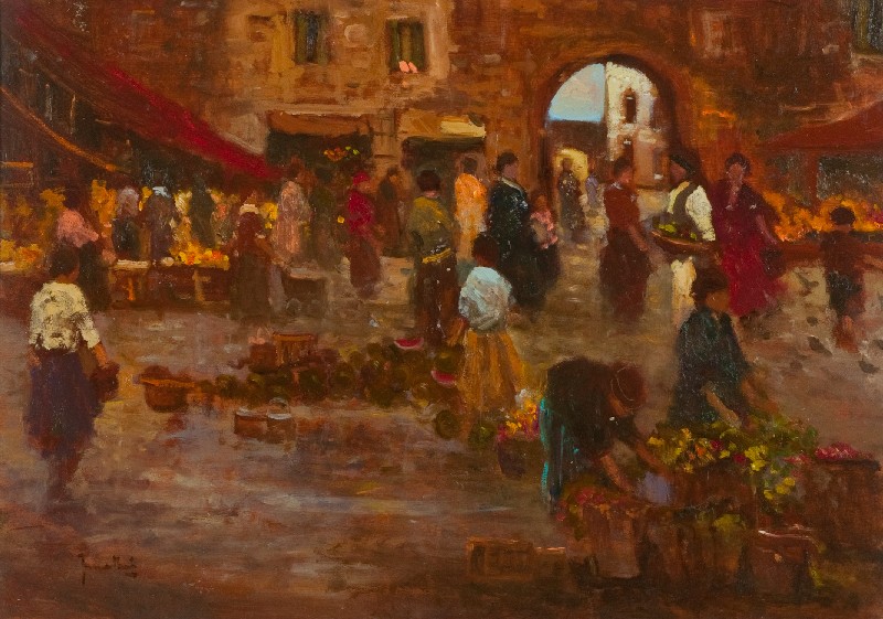 Enrico Frattini ( 1890 - 1968) MERCATO PAESANO Olio su tavola, cm. 50x70 Firmato in basso a sinistra. Sul verso: scritto di Autenticità dell'Artista.