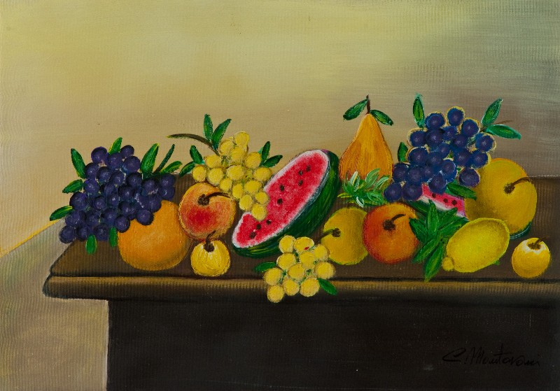Costanzo Mantovani TAVOLO CON FRUTTA, 2007 Acrilico su tela, cm. 50x70 Firmato in basso a destra. Sul verso: firma, data e titolo. Autentica dell'Artista su foto.