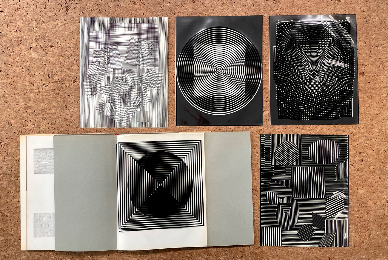 Il catalogo contiene all'interno 5 stampe su acetato e 5 ulteriori stampe sciolte su cartoncino che, sovrapposte, creano effetti ottici legati alla percezione visiva