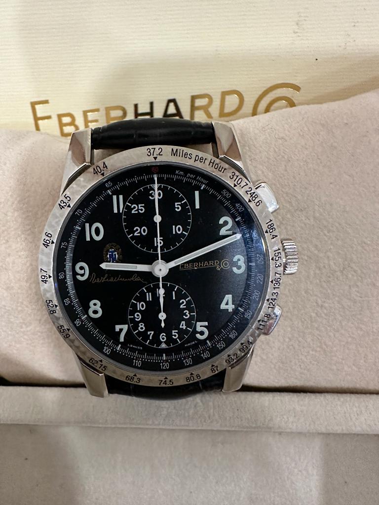 Marca Eberhard & Co. Modello (Orologio) Tazio Nuvolari Numero di referenza 31037 Materiale della cassa Acciaio Materiale cinturino Pelle Anno di produzione 1996 (Anno approssimativo) Corredo documenti originali, no box Carica Automatico Materiale della cassa Acciaio Diametro 39,5 mm Materiale lunetta Acciaio Vetro zaffiro Materiale cinturino Pelle Chiusura ad ardiglione Materiale chiusura Acciaio Funzioni Cronografo Altro Fondello trasparente, Cifre luminescenti, Lancette luminescenti