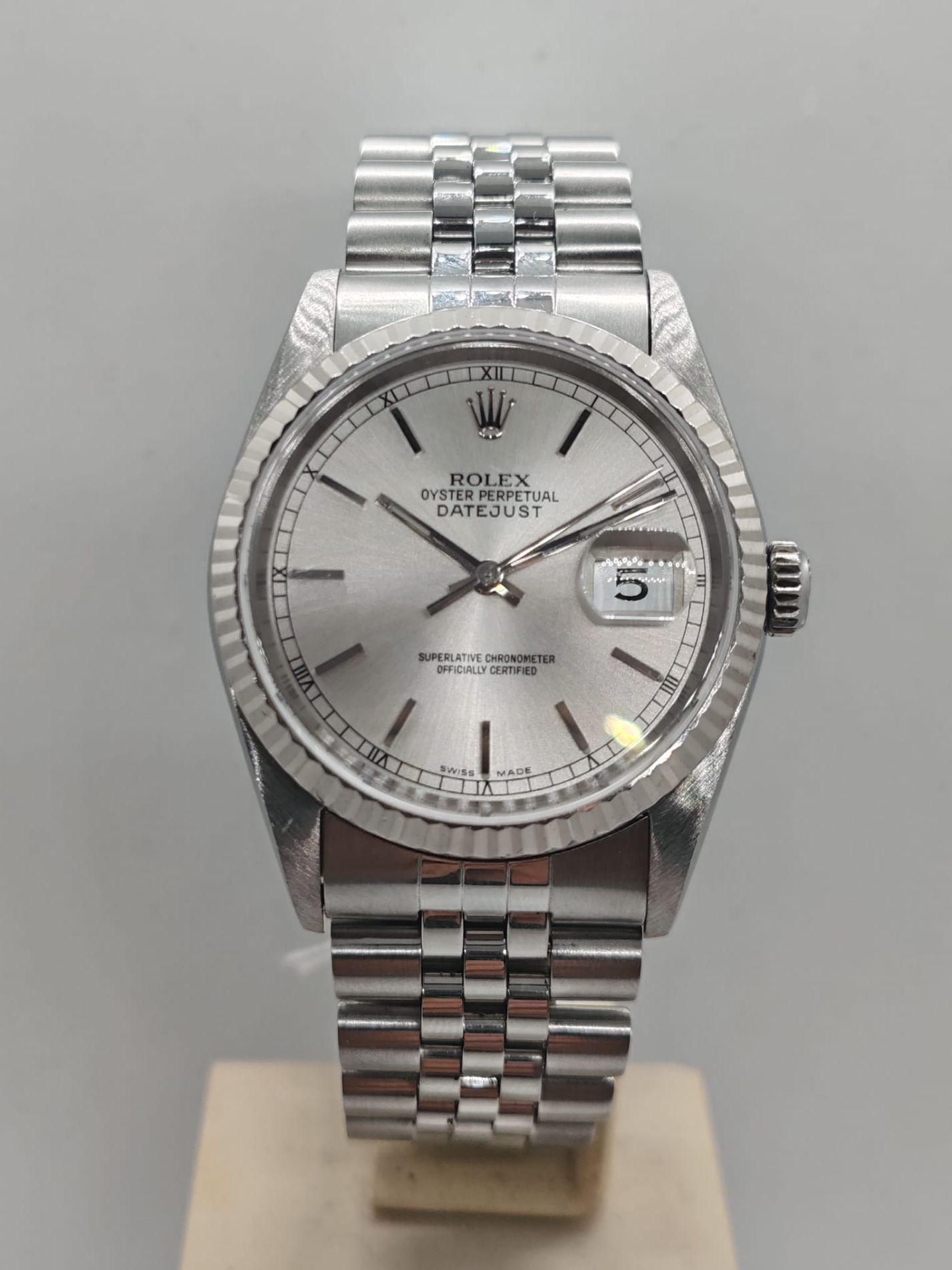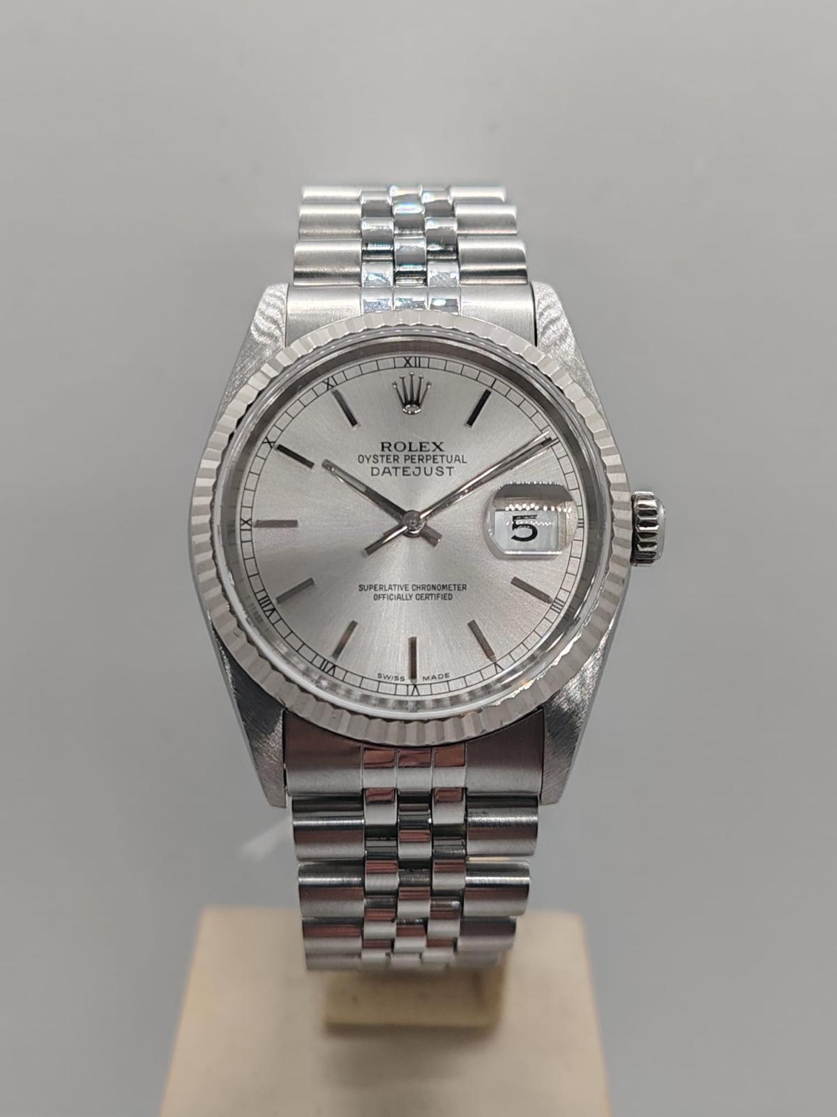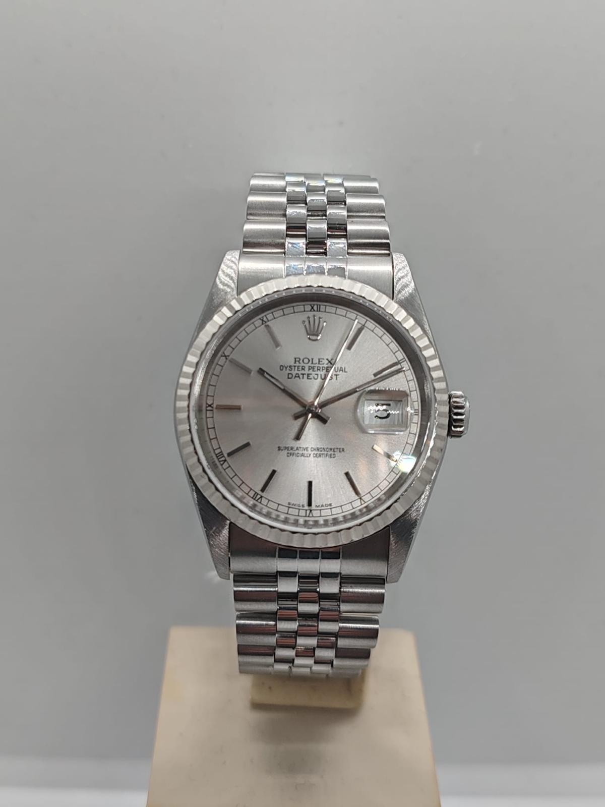 Marca Rolex Modello (Orologio) Datejust 36 Numero di referenza 16234 Carica Automatico Materiale della cassa Acciaio Materiale cinturino Acciaio Anno di produzione 2001 Condizione Ottimo (di seconda mano, segni di usura assenti o appena visibili) Corredo documenti originali Rolex, no box Carica Automatico Materiale della cassa Acciaio Diametro 36 mm Impermeabile 10 ATM Materiale lunetta Oro bianco Vetro Vetro zaffiro Quadrante Argento Numeri sul quadrante Senza numeri Cinturino Materiale cinturino Acciaio Colore cinturino Acciaio Chiusura Déployante Materiale chiusura Acciaio Funzioni Data