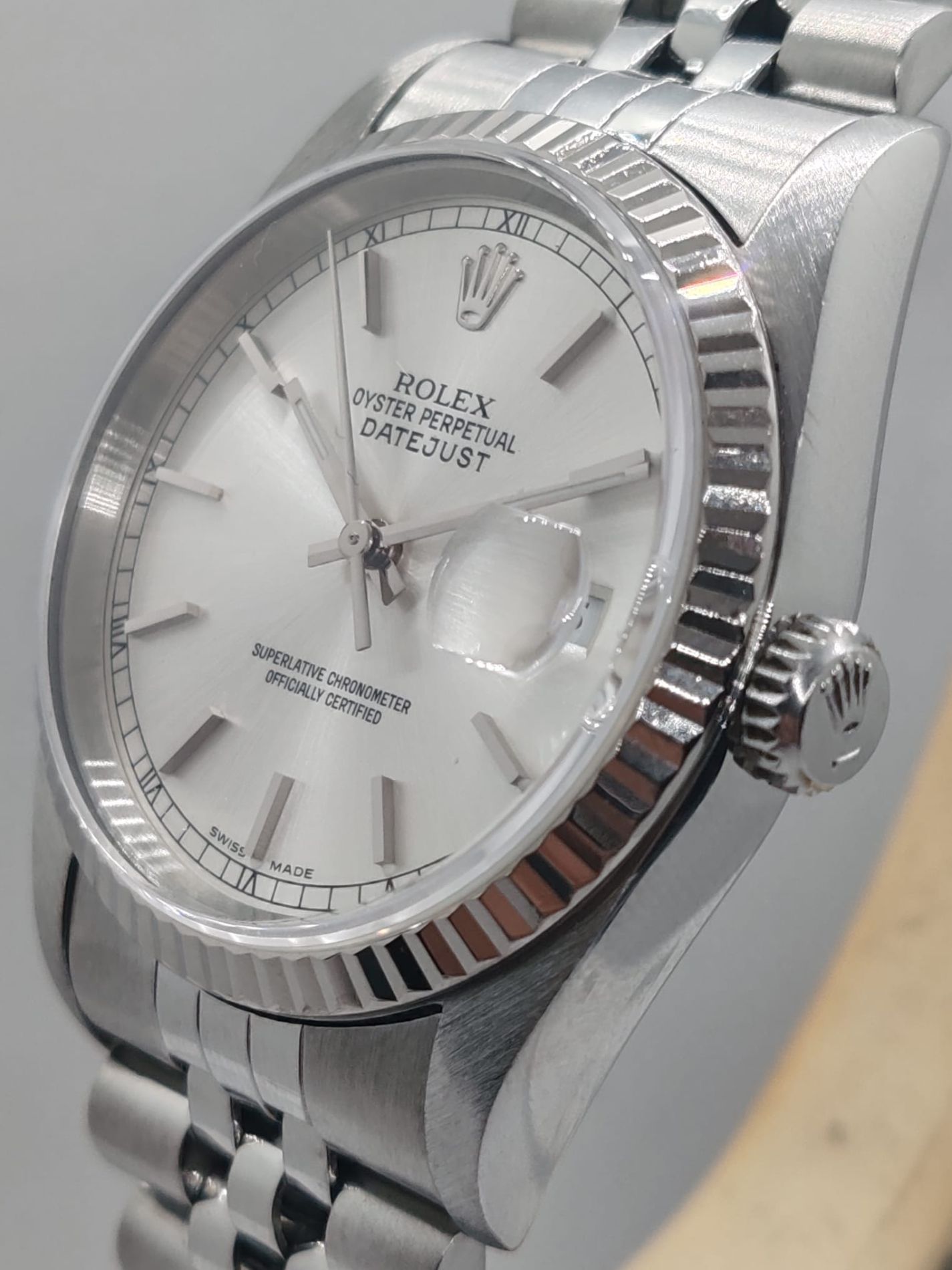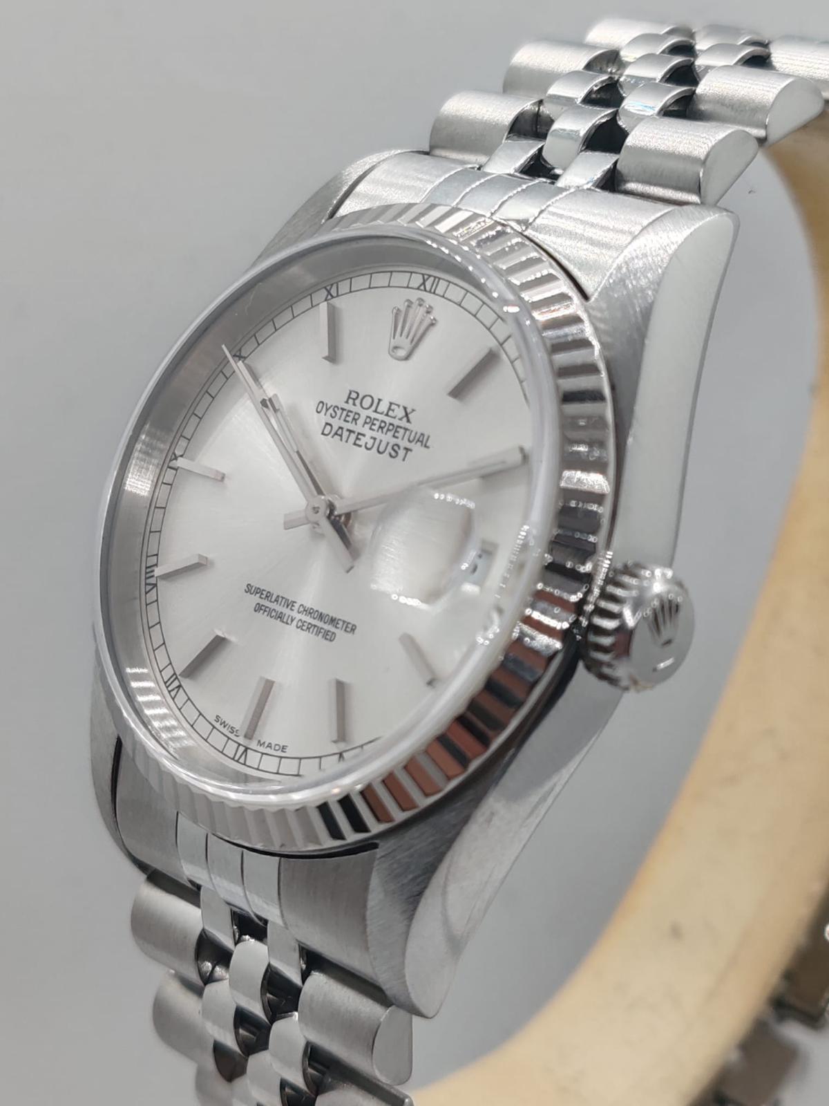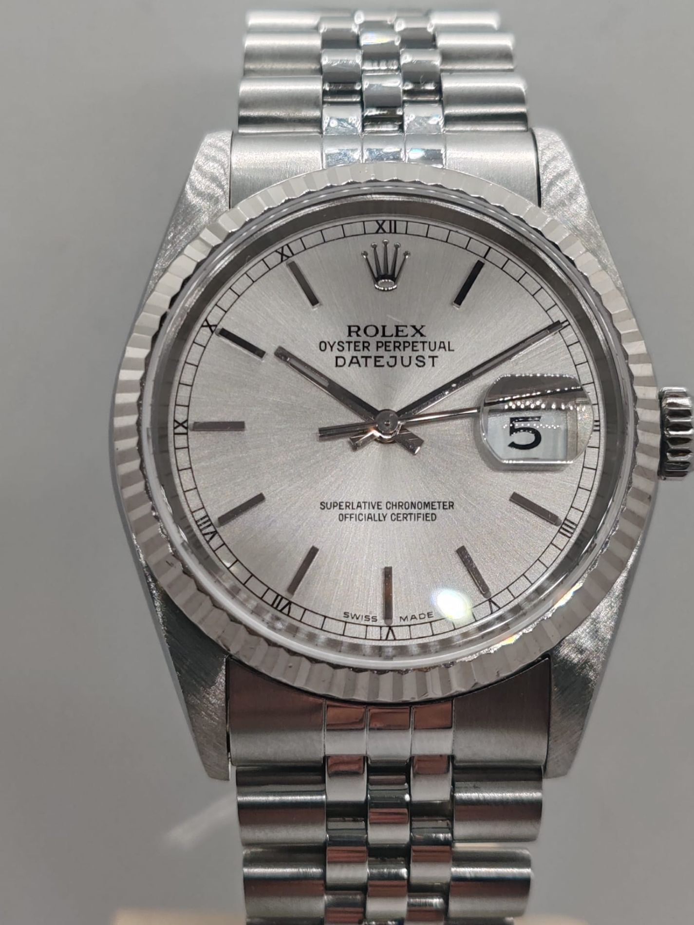 Marca Rolex Modello (Orologio) Datejust 36 Numero di referenza 16234 Carica Automatico Materiale della cassa Acciaio Materiale cinturino Acciaio Anno di produzione 2001 Condizione Ottimo (di seconda mano, segni di usura assenti o appena visibili) Corredo documenti originali Rolex, no box Carica Automatico Materiale della cassa Acciaio Diametro 36 mm Impermeabile 10 ATM Materiale lunetta Oro bianco Vetro Vetro zaffiro Quadrante Argento Numeri sul quadrante Senza numeri Cinturino Materiale cinturino Acciaio Colore cinturino Acciaio Chiusura Déployante Materiale chiusura Acciaio Funzioni Data