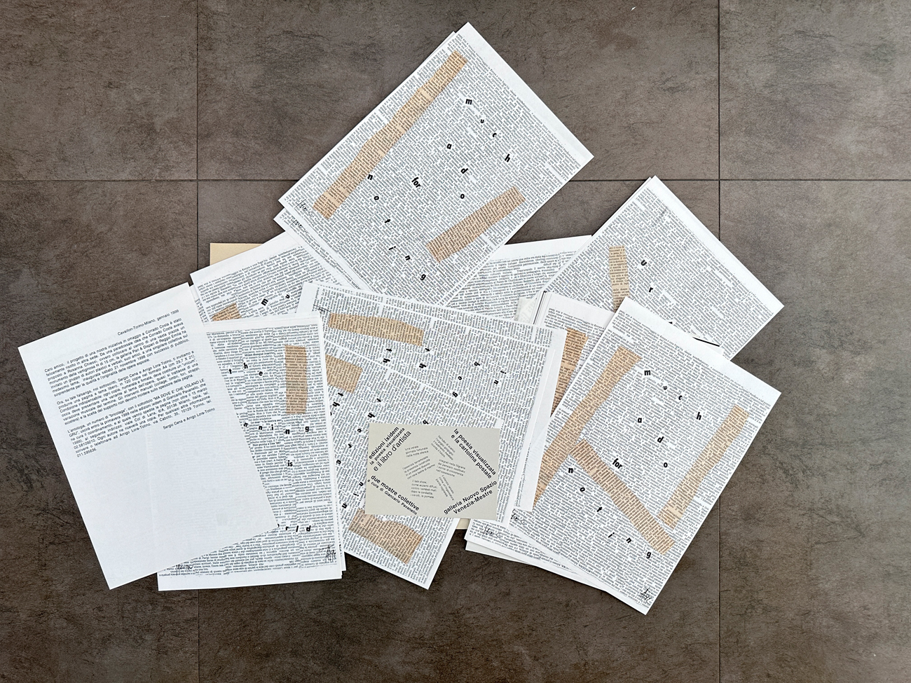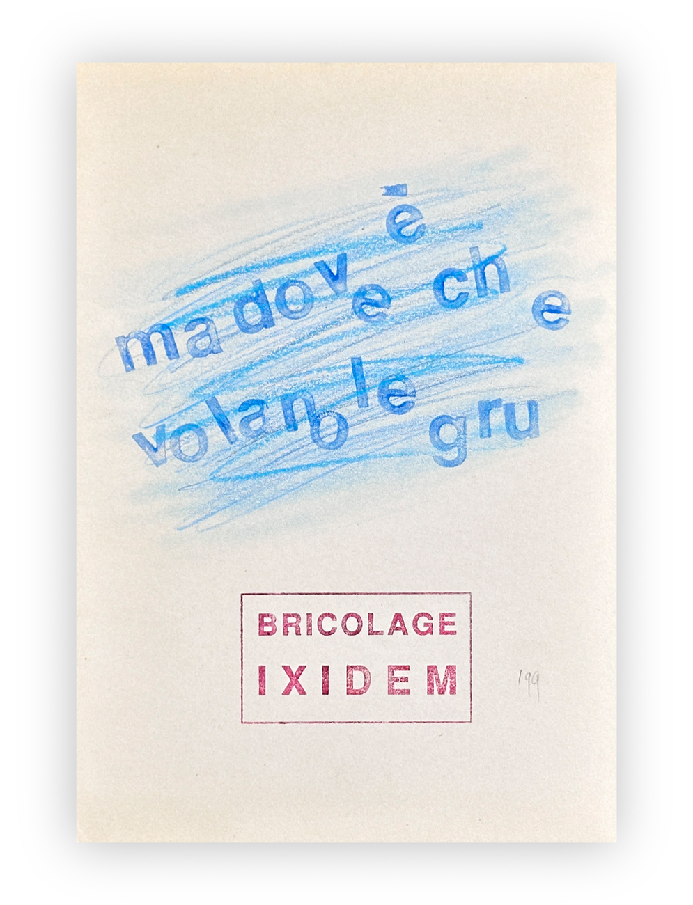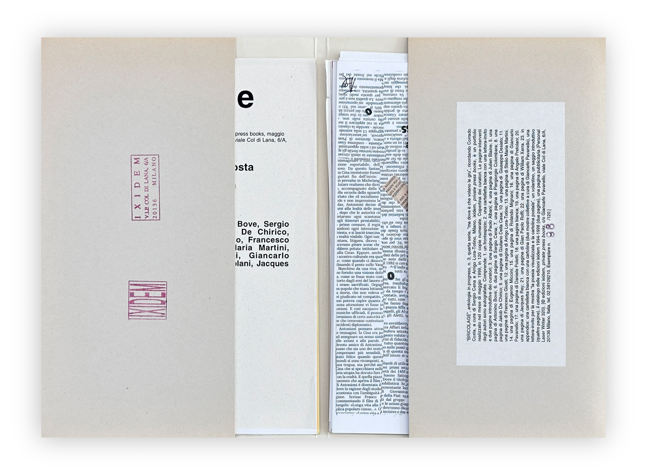 Portfolio completo contenente pagine-interventi autografati dei seguenti autori: Paolo Albani, Julien Blaine, Antonino Bove, Sergio Cena, Piergiorgio Colombara, Jakob De Chirico, Giuliano Della Casa, Giuseppe Desiato, Francesco Giusti, Arrigo Lora-Totino, Stelio Maria Martini, Eugenio Miccini, Rolando Mignani, Giancarlo Pavanello, Daniele Poletti, Angelo Pretolani, Jacques Rey, Gian Paolo Roffi e William Xerra oltre a numerosi inserti