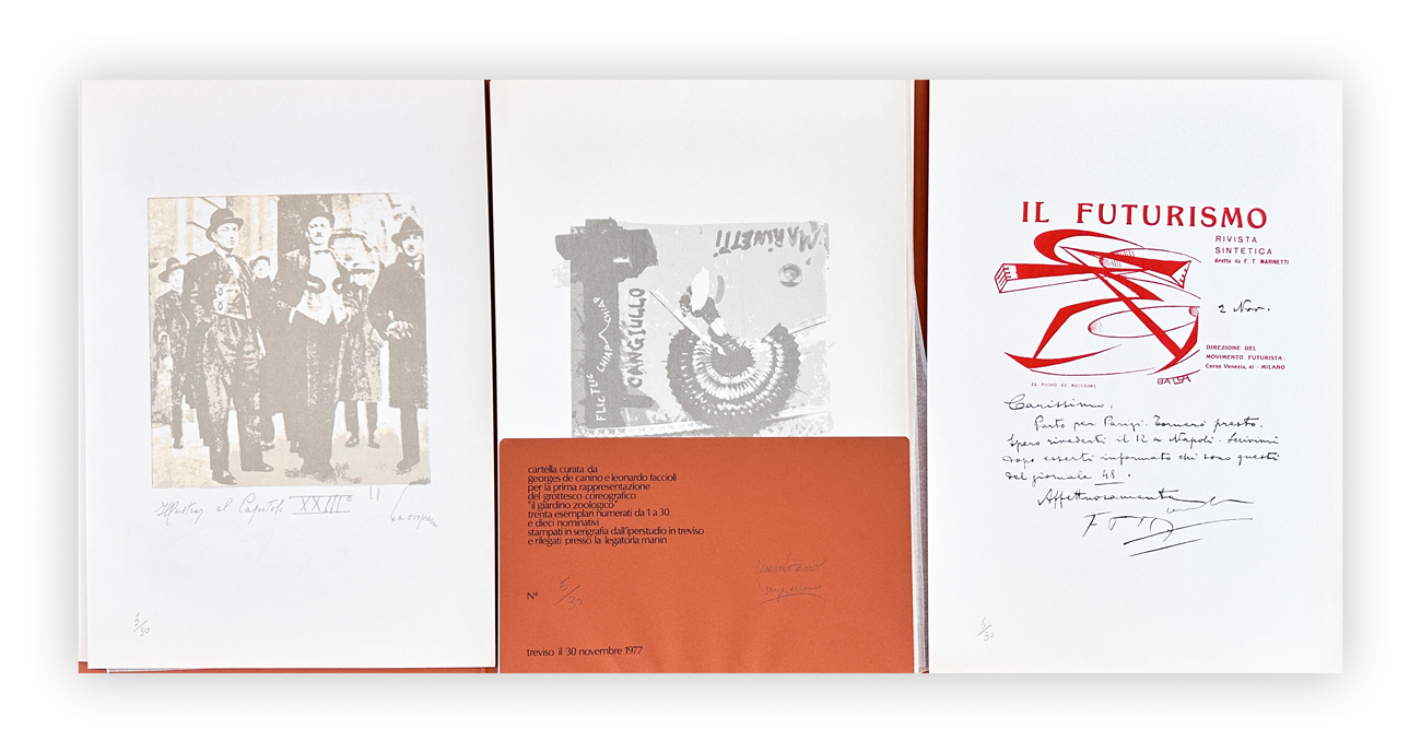 Cartella curata da Georges De Canino e Leonardo Faccioli per la prima rappresentazione del grottesco coreografico "il giardino zoologico" contenente 7 tavole serigrafiche recanti numerazione (Esemplari 5/30)