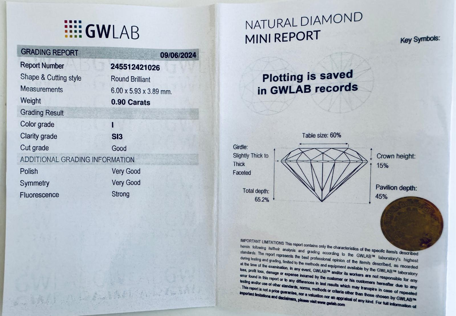 DIAMANTE NATURAL POLISHED 0,9 CARATI COLORE I - PUREZZA SI3 - TAGLIO BRILLANTE - CERTIFICATO GW - C40509-6