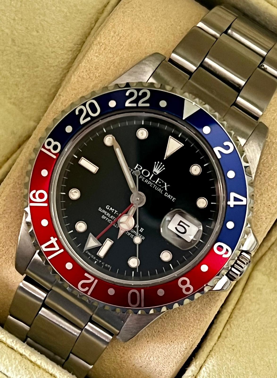 Marca Rolex Modello (Orologio) GMT-Master II Numero di referenza 16710 Carica Automatico Materiale della cassa Acciaio Materiale cinturino Acciaio Condizione Usato L'articolo presenta segni di usura lievi, come ad esempio graffi leggeri, ma non percepibili al tatto. no documenti originali Rolex, no box la scatola utilizzata solo per fotografie non in vendita Carica Automatico anni 90 Materiale della cassa Acciaio Diametro 40 mm Impermeabile 10 ATM Materiale lunetta Acciaio Vetro Vetro zaffiro Quadrante Nero Numeri sul quadrante Senza numeri Cinturino Materiale cinturino Acciaio Colore cinturino Acciaio Chiusura Déployante Materiale chiusura Acciaio Funzioni Data, GMT
