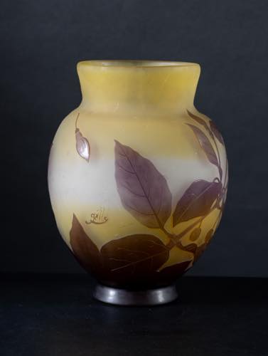 Decoro di fiori e foglie nei toni del porpora su fondo nei toni del giallo e del bianco, firmato Gallé.