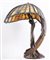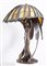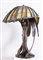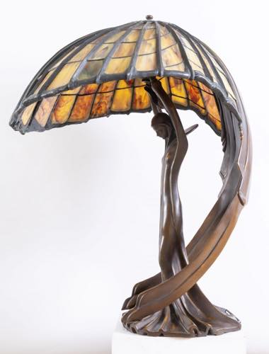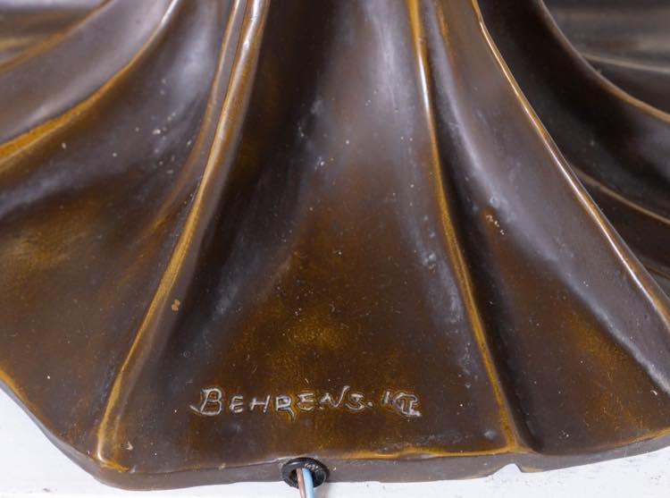 Lampada da tavolo con paralume in tessere di vetro nei toni del giallo, verde e arancio legate a piombo a disegni geometrici. Base in bronzo a patina scura a guisa di fanciulla che sorregge il paralume, come Atlante sorregge il globo. Da un disegno del 1902 di Peter Beherens. Firmata Behrens KT sulla base. Peso circa 30 kg. Realizzata negli anni '80. Produzione Tiffany Art Glass s.a.s. - di Reggianini & Co. Carpi, Modena. Modello LB 65 LB 65 S. Note L'unico esemplare originale fu disegnato da Peter Behrens per gli interni dell'edificio residenza della Colonia degli artisti di Darmstadt, dove un gruppo di artisti dello Jugendstill vissero e produssero le loro opere. Attualmente conservata presso Hessian House Wissenschaftsstadt, Darmstadt.