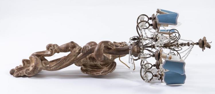 da cui partono bracci in metallo con portalampada. E' arricchita da catene di cristalli