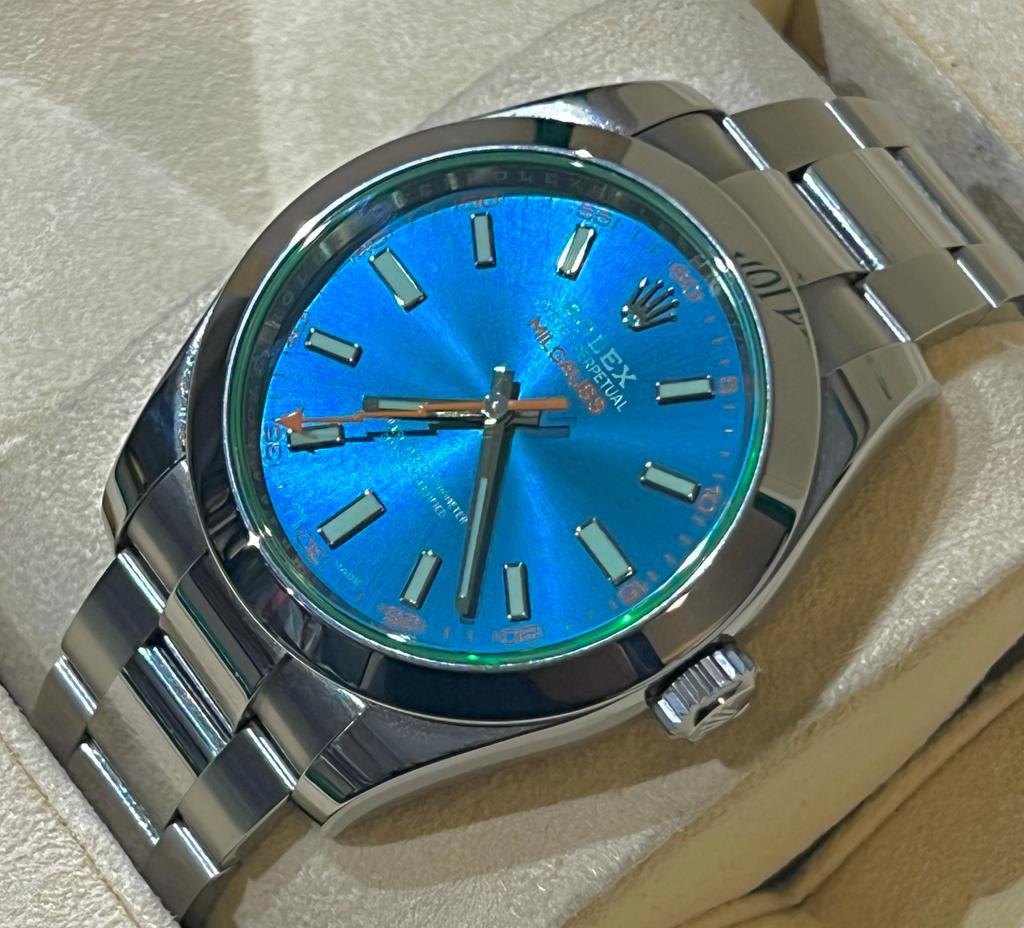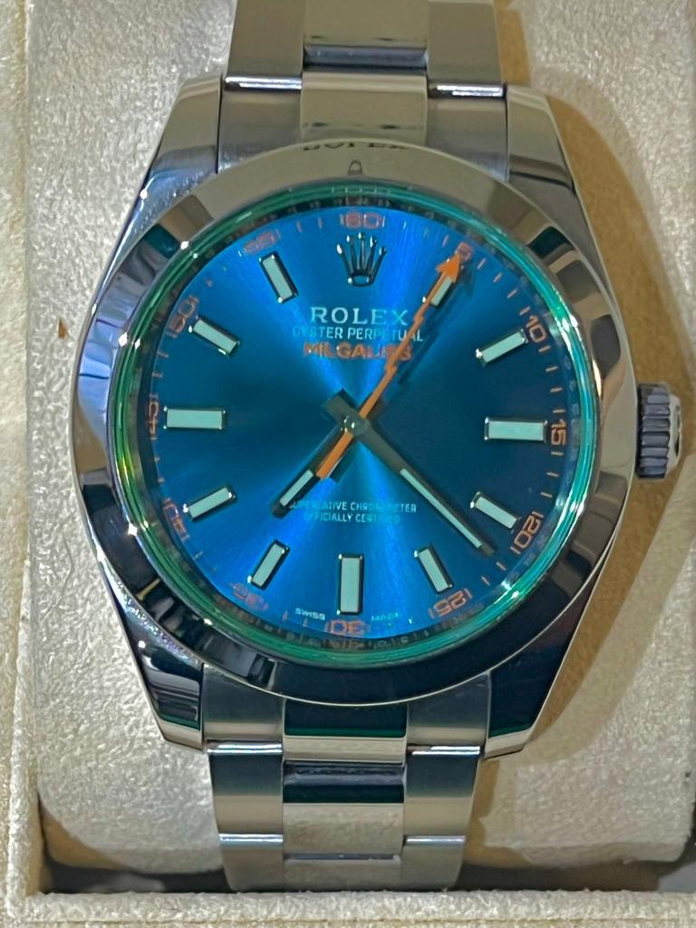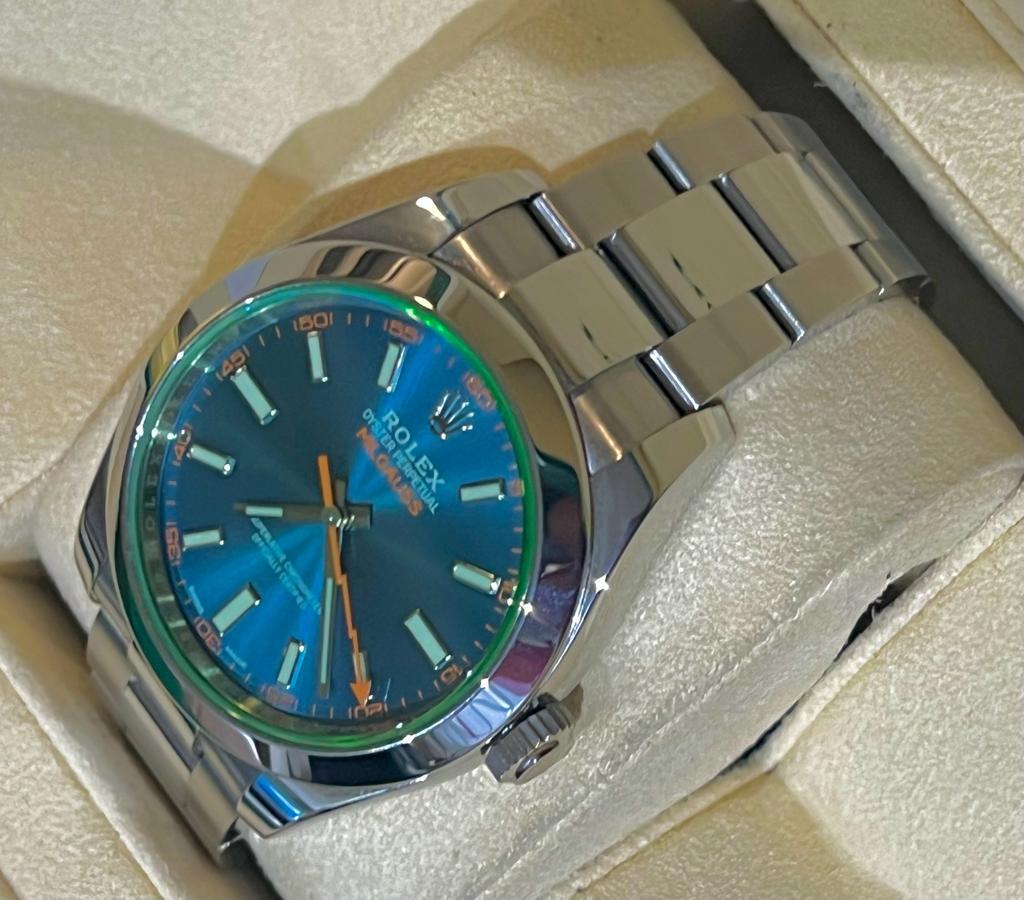 Marca Rolex Modello (Orologio) Milgauss Numero di referenza 116400GV Carica Automatico Materiale della cassa Acciaio Materiale cinturino Acciaio Anno di produzione 2015/18 Corredo documenti originali, no box la scatola utilizzata solo per fotografie non in vendita Carica Automatico Materiale della cassa Acciaio Diametro 40 mm Impermeabile 10 ATM Materiale lunetta Acciaio Vetro Vetro zaffiro Quadrante Blu Numeri sul quadrante Senza numeri Cinturino Materiale cinturino Acciaio Colore cinturino Acciaio Chiusura Déployante Materiale chiusura Acciaio
